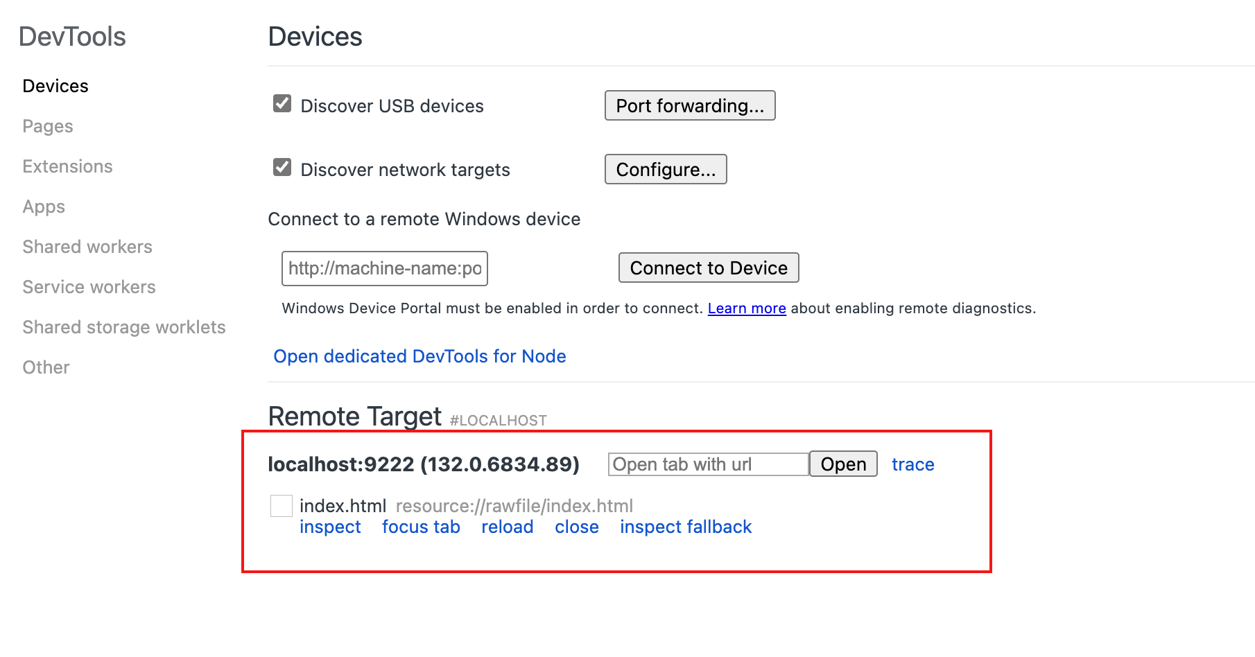 这时候,用电脑浏览器,例如 Edge 浏览器,在网址输入框中输入 edge://inspect/#devices 就可以看到 APP 的 H5 页面已经被 Inspect 到: