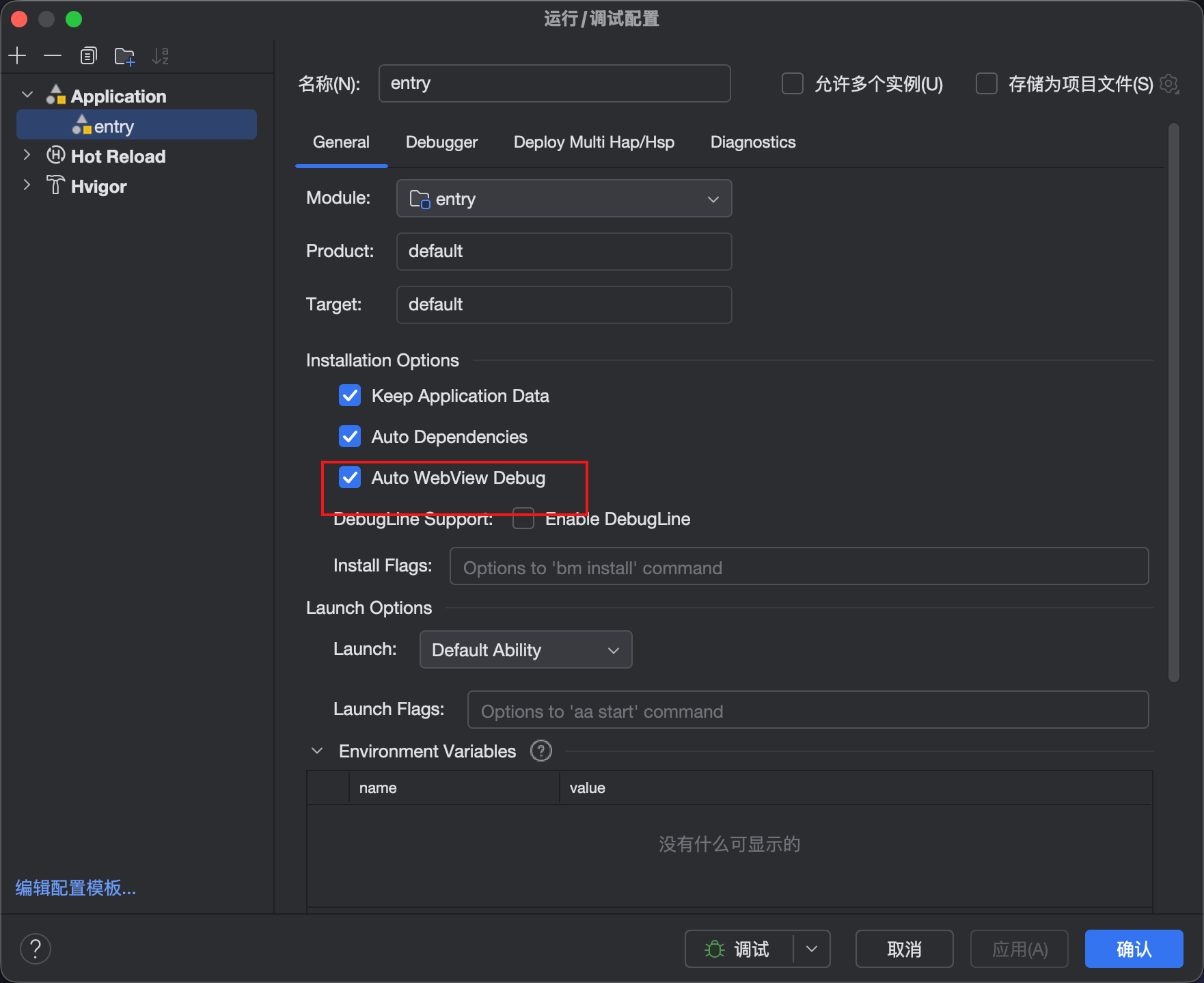 打开运行/调试配置页,将如图的选项勾选。勾选了 『Auto WebView Debug』这一运行选项后,下次运行工程,在运行窗口就会看到打印如下一行提示: