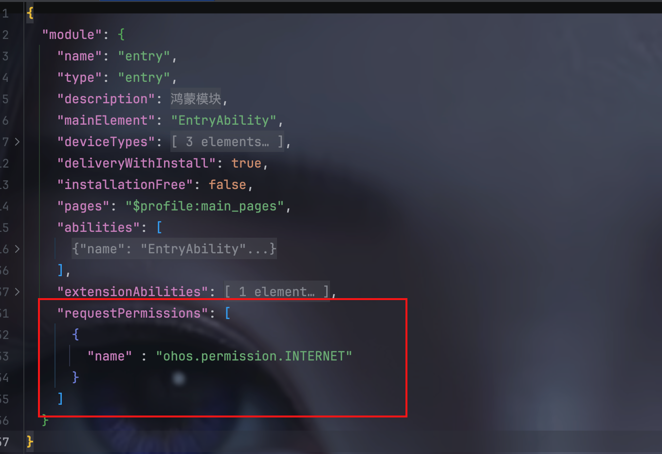 即便APP所使用的 H5 页面,就放在应用工程目录中,换句话说,即便你的APP完全用不到网络,但是为了支持 H5 调试,还是必须申请一个网络权限。在鸿蒙应用中,网络权限是非受限权限,权限的申请很简单,就是在 entry 模块的 module.json5 中添加如图所示的代码: