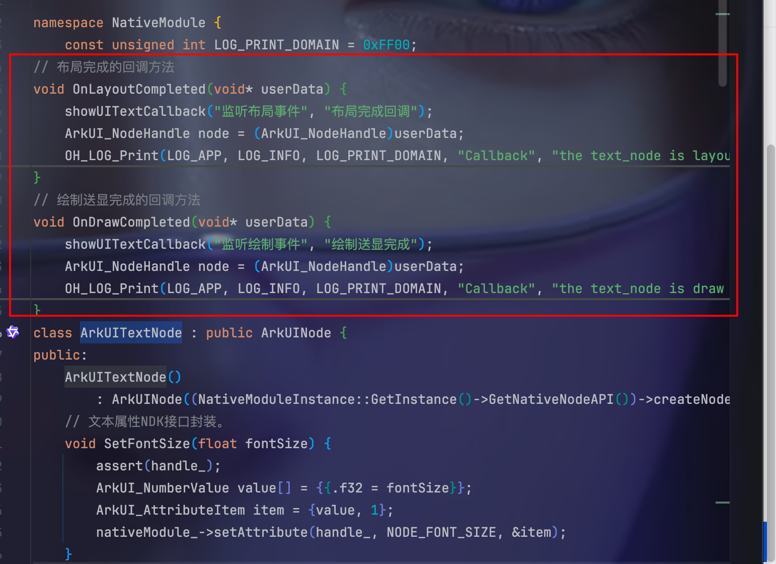首先,在 ArkUITextNode 类的定义体上方,NativeModule 命名空间之内,也就是如图的位置: