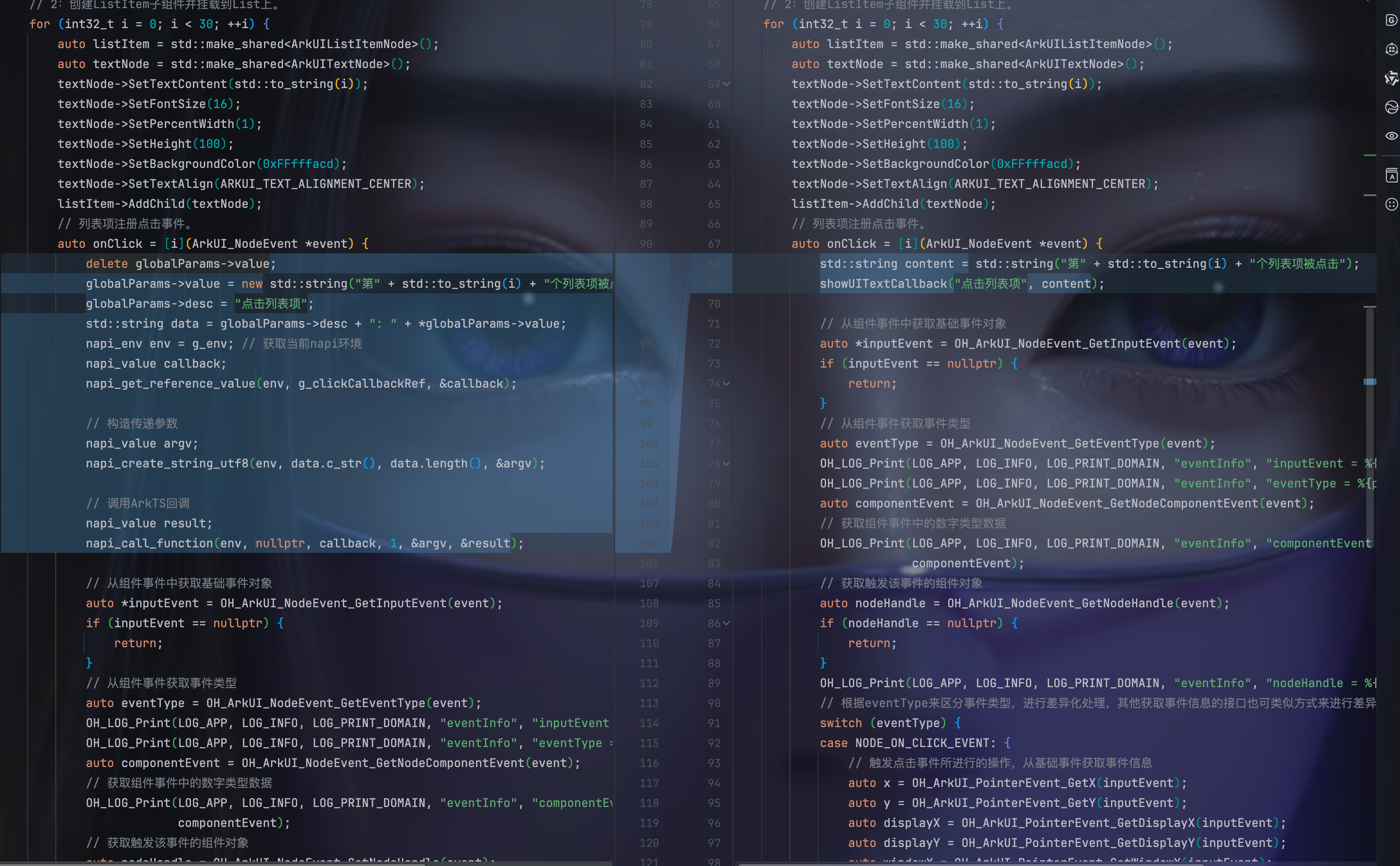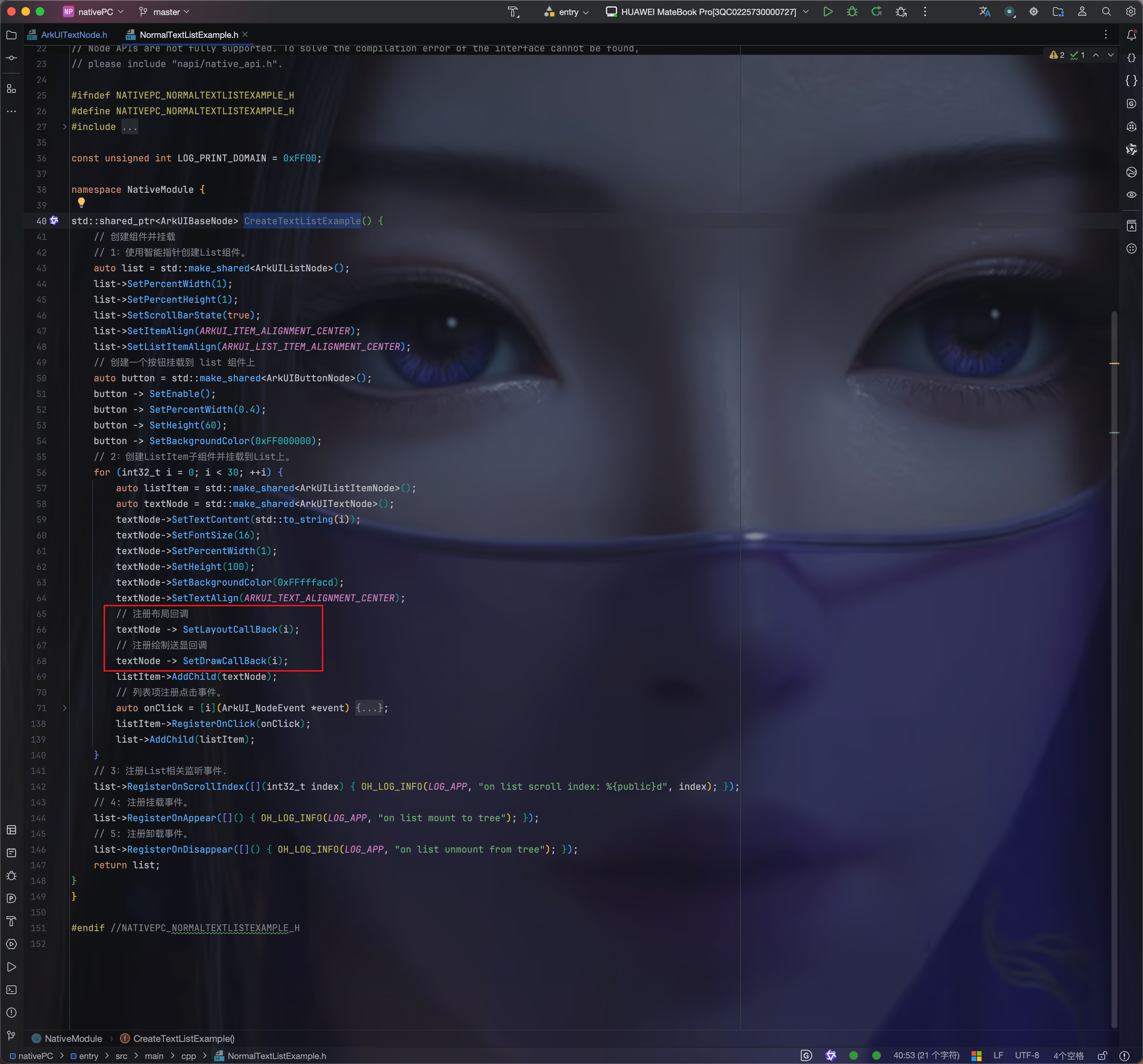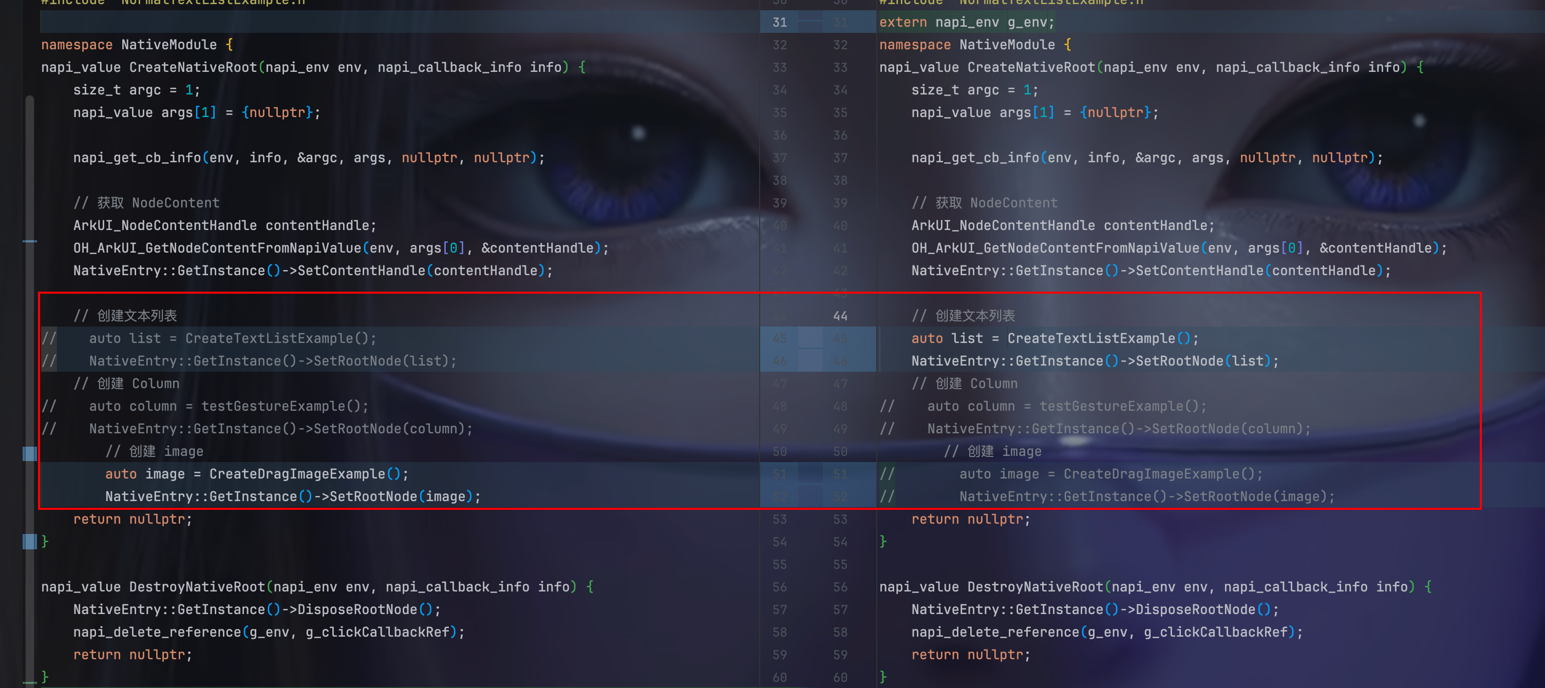 为了演示上面的目标功能,我们需要一个 UI 组件节点作为『舞台』,这里,我选中继续服用之前的列表组件,也就是需要将 NativeEntry.cpp 的 CreateNativeRoot 中创建文本列表的两行代码取消注释,并将上一篇中用到的图片节点的代码给注释掉。