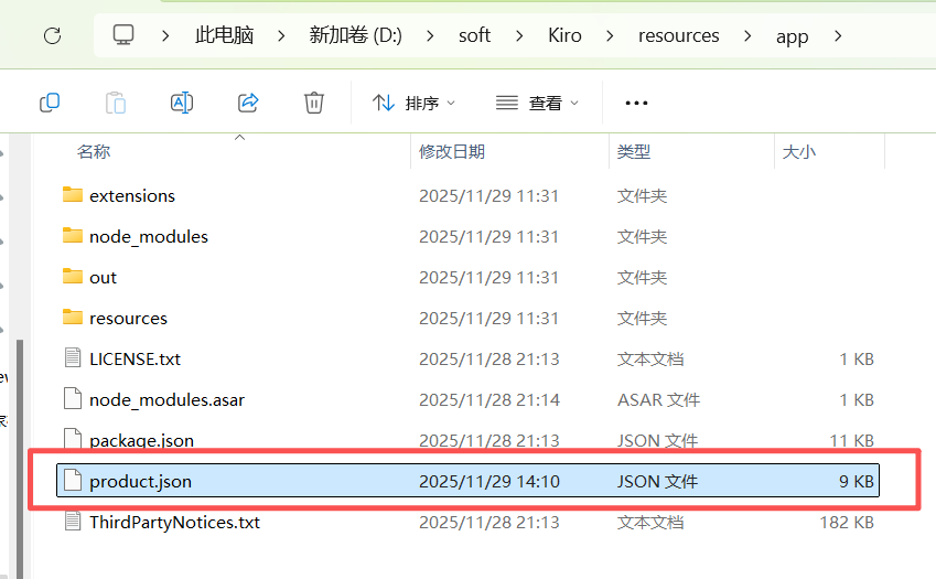 此时需要打开安装Kiro的位置,找到product.json: