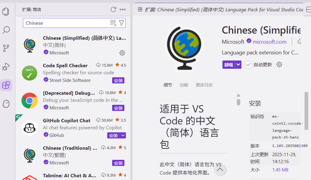 Error while installing 'chinese (Simplified)(简体中文) LanguagePack for Visual Studio Code" extension. Please check the log formore details.