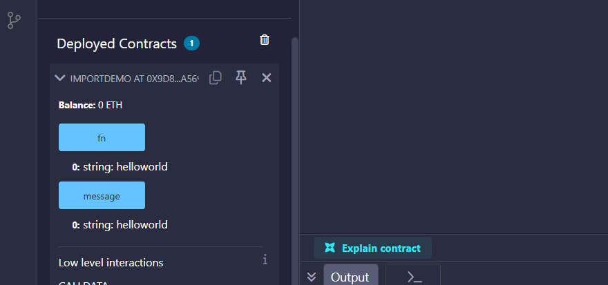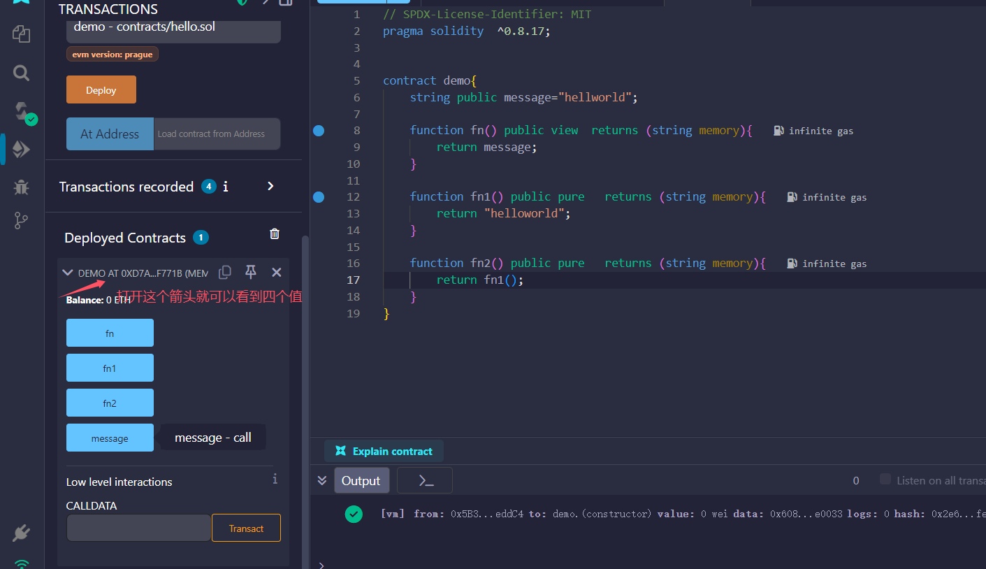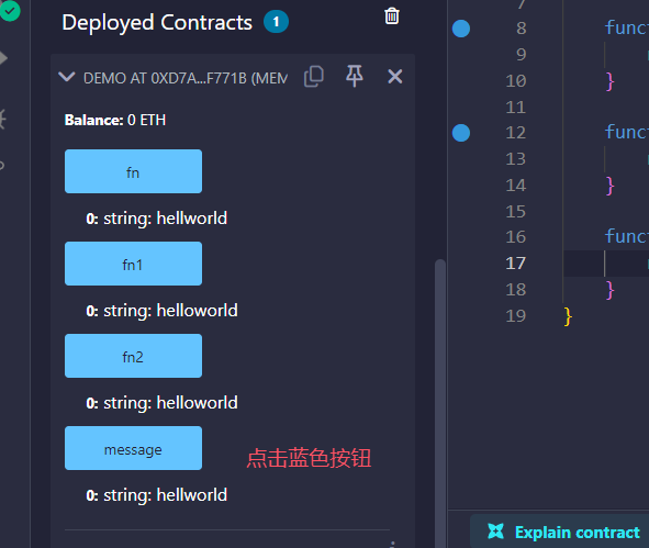 - 'fn1'函数 是一个公共的视图函数(view),用于返回状态变量'message' 的值。 因为它只读取数据而不修改状态,所以被声明为视图函数。