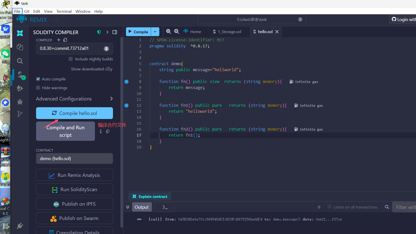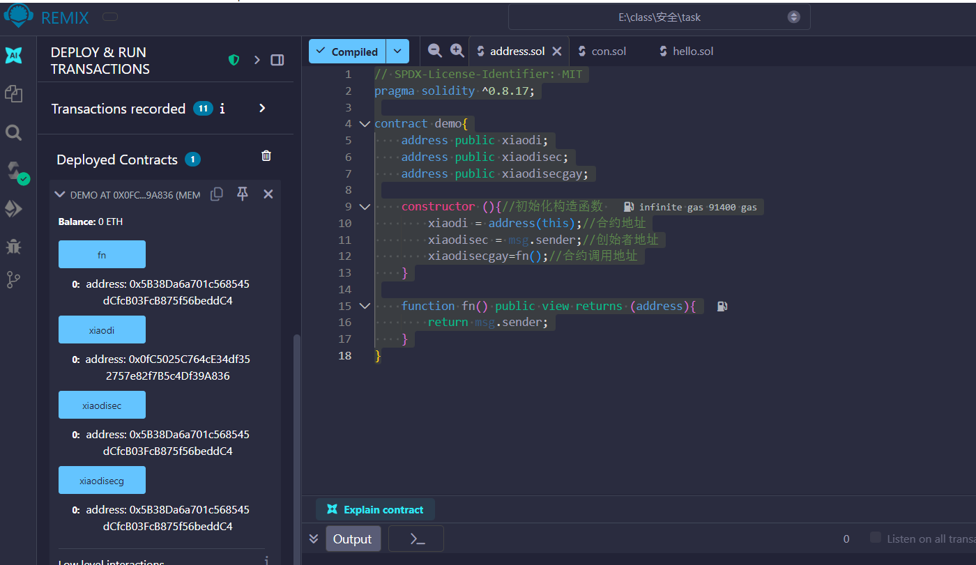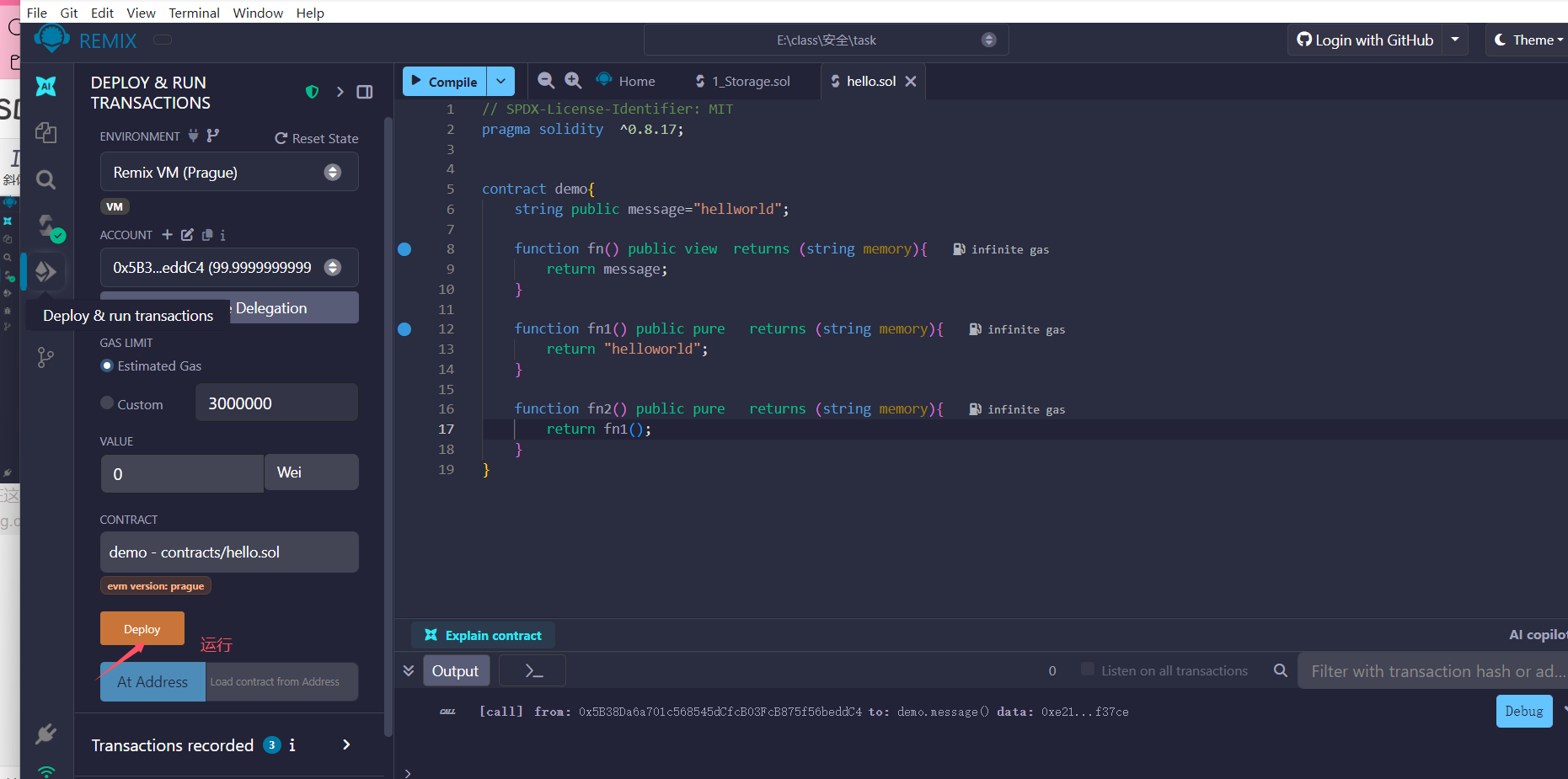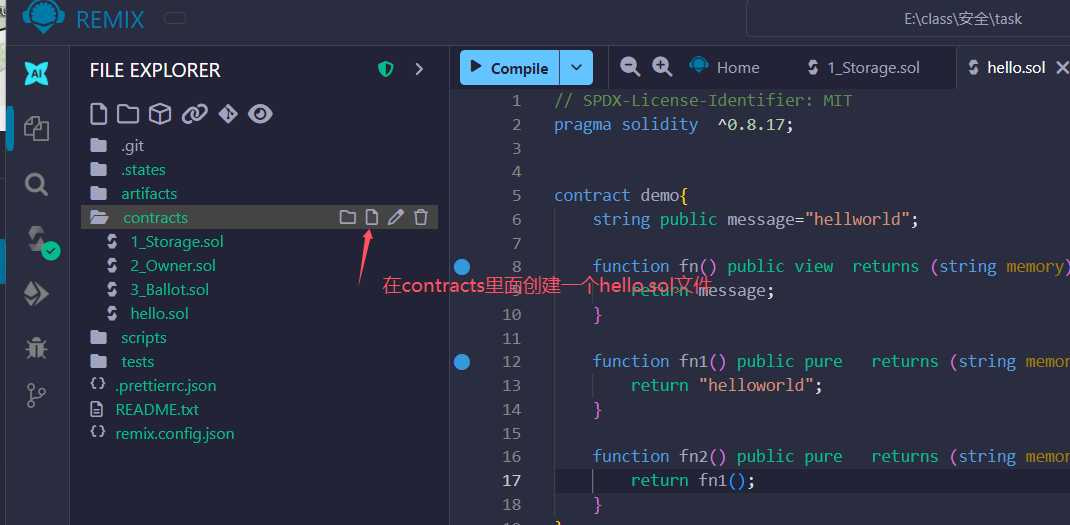 - 'fn2'函数 是一个公共的纯函数(pure),用于返回字符串 "Hello World!"。因为它不读取状态变量,所以被声明为纯函数。纯函数不访问合约的状态变量,只依赖于输入参数或其他纯函数的输出