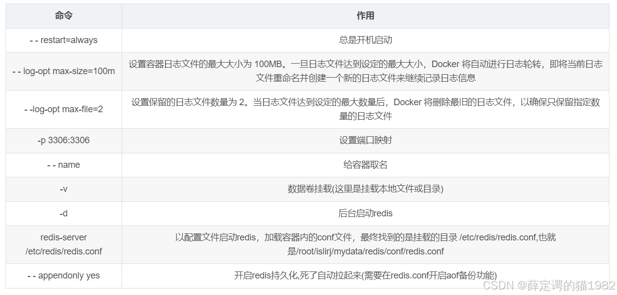 docker run --restart=always --log-opt max-size=100m --log-opt max-file=2 -p 6379:6379 --name myredis -v /myredis/redis/conf/docker-redis.conf:/etc/redis/redis.conf -v /myredis/redis/data:/data -d redis:4.0.9 redis-server /etc/redis/redis.conf --appendonly yes