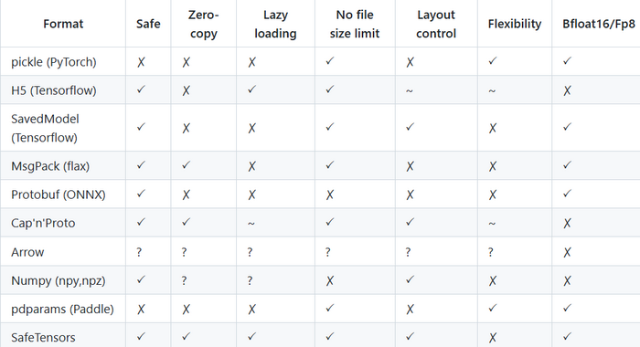 Safetensors与其它文件格式对比,如下图所示:来自于官方截图