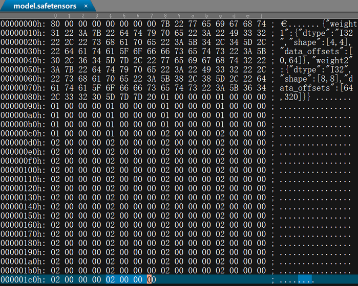 头部是一个字典:{"TENSOR_NAME": {"dtype": "F16", "shape": [1, 16, 256], "data_offsets": [BEGIN, END]}, "NEXT_TENSOR_NAME": {...}, ...}
