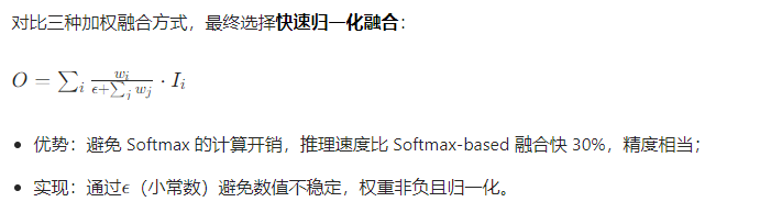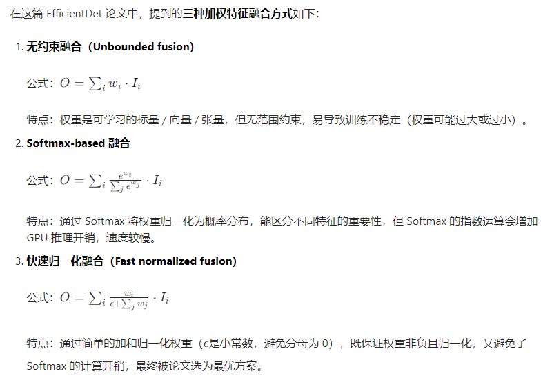 5、加权特征融合:BIFPN为每个输入特征的学习权重,去实现自适应加权融合,提升融合效果