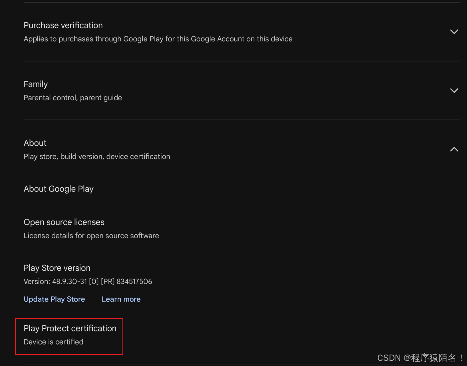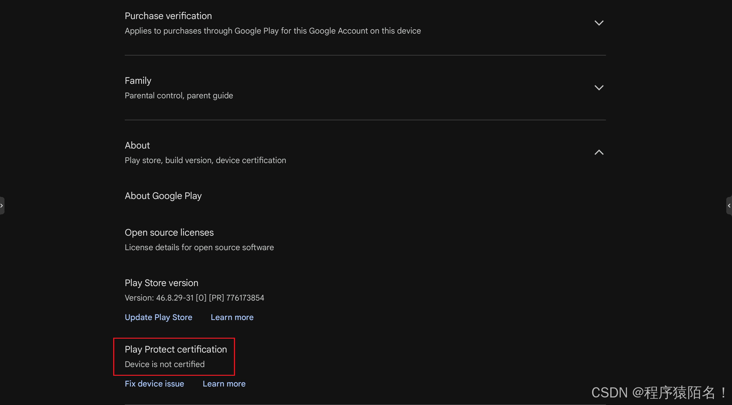 查看机器认证状态:Play Store -> Settings -> About -> Play Protect certification