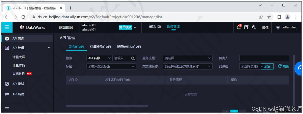 DataWorks的数据服务功能模块是灵活轻量、安全稳定的数据API构建平台,旨在为企业提供全面的数据共享能力,帮助用户从发布审批、授权管控、调用计量、资源隔离等方面实现数据价值输出及共享开放。下图展示DataWorks的数据服务。