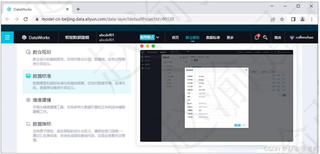 数据建模是阿里云DataWorks自主研发的智能数据建模产品,沉淀了阿里巴巴十多年来数仓建模方法论的最佳实践,包含数仓规划、数据标准、维度建模及数据指标四大模块,帮助企业在搭建数据中台、数据集市建设过程中提升建模及逆向建模的能力,并通过数据建模快速构建企业数据资产。