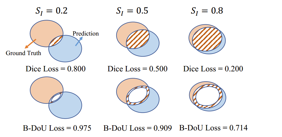其中,TP、FP和FN分别表示真正例 (True Positive)、假正例 (False Positive) 和假反例 (False Neqative)。可以看出,边界交并差损失(Boundary DoU Loss)与Dice损失的区别仅在于交集面积所占的比例。Dice损失关注的是整个交集面积,而由于α<1\alpha<1α<1,边界交并差损失则更关注边界区域。与Dice损失函数类似,最小化LDoUL_DoULDoU 将促使交集面积增大 (SI↑)(S_I\uparrow)(SI↑) 和差异集面积减小 (SD↓)(S_D\downarrow)(SD↓) 。同时,LDoUL_DoULDoU 会对SD/SIS_D/S_ISD/SI的比值施加更大的惩罚。为了更清晰地验证其有效性,我们在图2中比较了不同情况下LDiceL_{Dice}LDice和LDoUL_{DoU}LDoU 的值。LDiceL_{Dice}LDice随差异集面积的增大而线性减小,而当SIS_ISI足够大时,LDoUL_{DoU}LDoU的减小速度会更快。