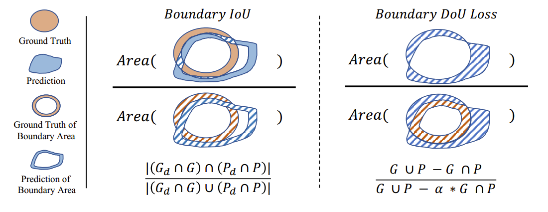 第三类则侧重于边界分割。豪斯多夫距离损失(Hausdorff Distance Loss)[12]旨在优化豪斯多夫距离,而边界损失(Boundary Loss)[13]则通过计算预测边界上每个点与对应真实标签点之间的距离作为权重,对每个点的预测概率进行加权求和。然而,当前用于优化分割边界的损失函数往往依赖于结合不同的损失函数,或存在训练不稳定的问题。为解决这些问题,我们提出了一种受边界交并比(Boundary IoU)指标[6]启发的简单边界损失函数,即边界交并差损失(Boundary DoU Loss)。