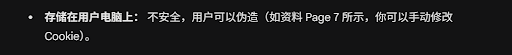 安全性 :资料 Page 7 展示了你可以手动在浏览器里修改 Cookie (