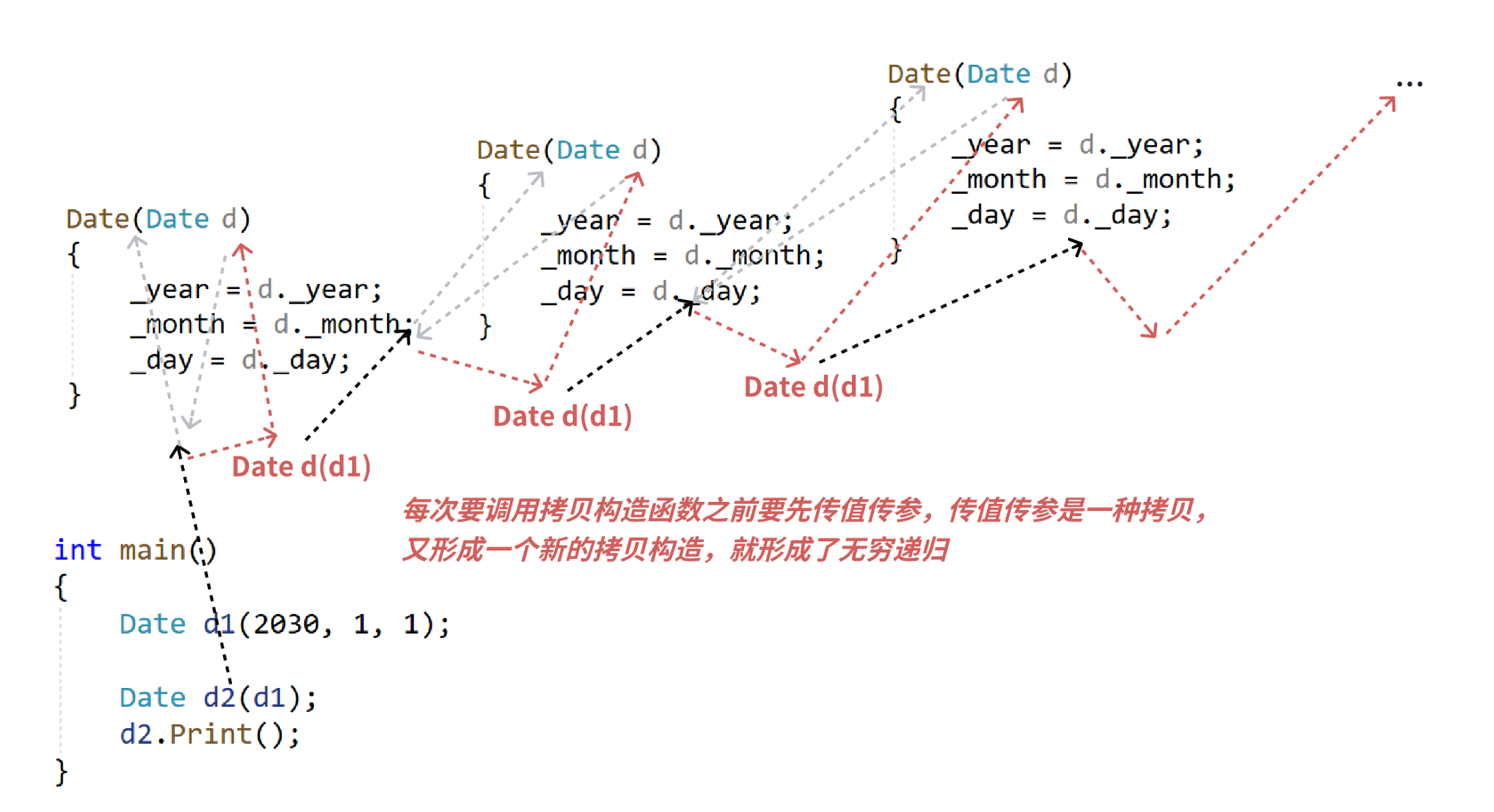 来看我们在调用拷贝函数的时候,传值传参是一种拷贝行为,传过去之后,调用拷贝函数,在调用的时候,又要传值传参,还要调用拷贝函数,就不返回了,一直死递归。所以我们要引用接收。