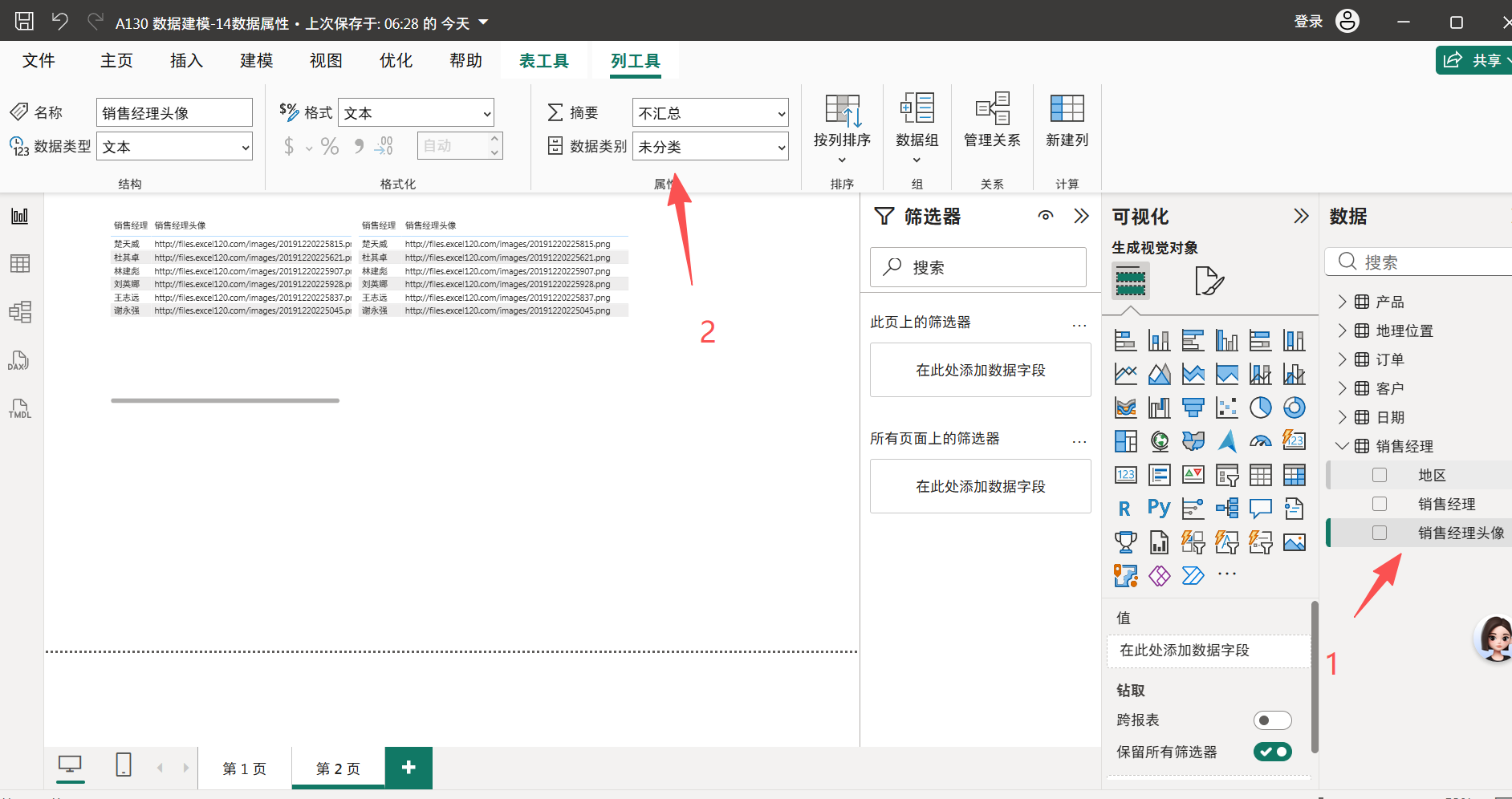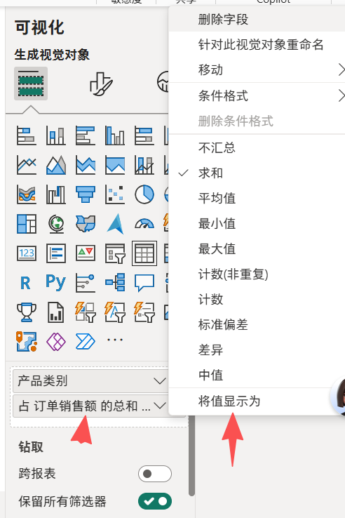 选中表格销售额 点销售额 向下的箭头------》将值显示为