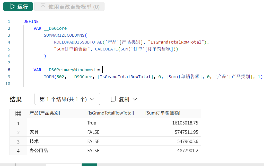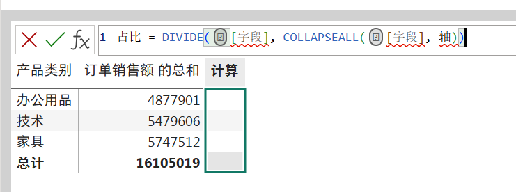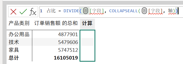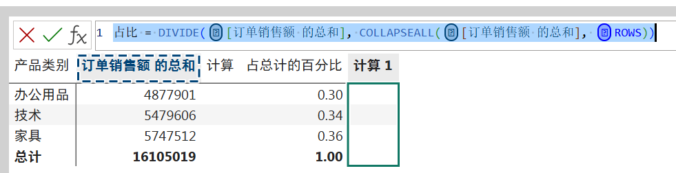 RETURN CALCULATE(SUM('订单'[订单销售额]),vItems) / CALCULATE(SUM('订单'[订单销售额]),ALL('产品'[产品子类别]))