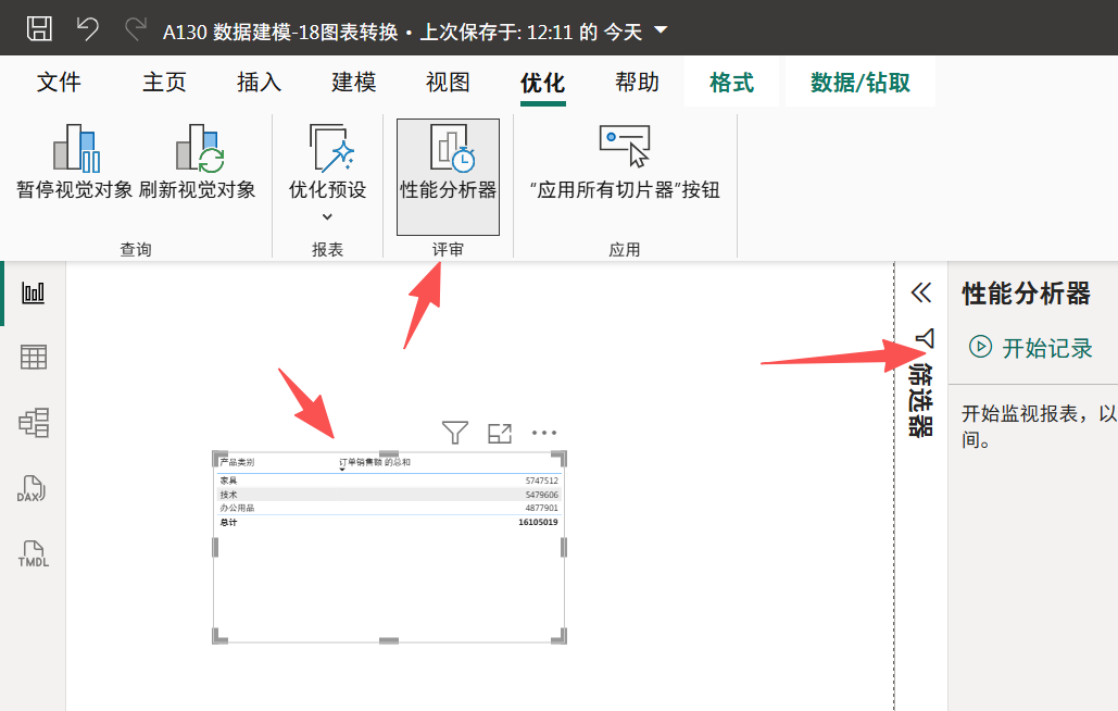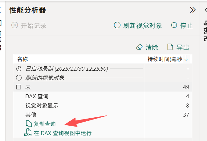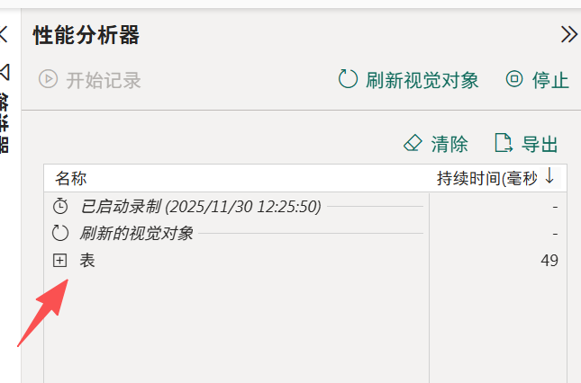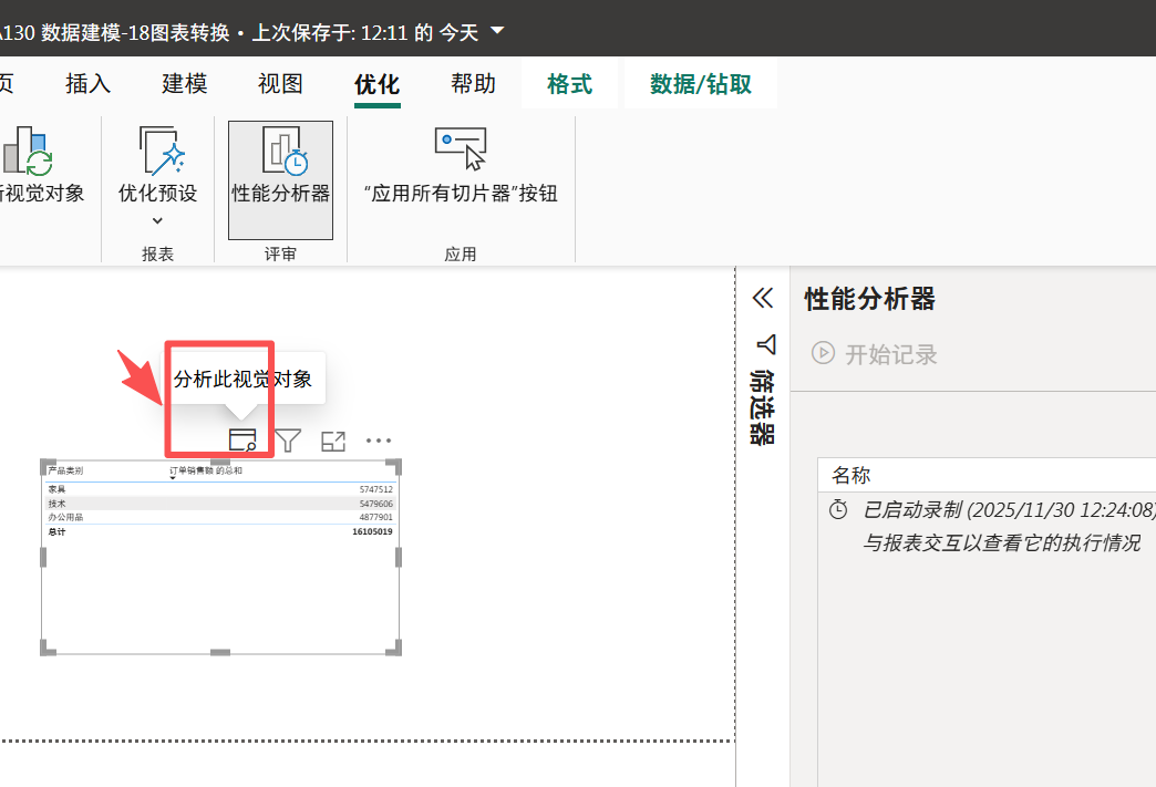 选中图表,点击上面的优化------》性能分析器------》开始记录