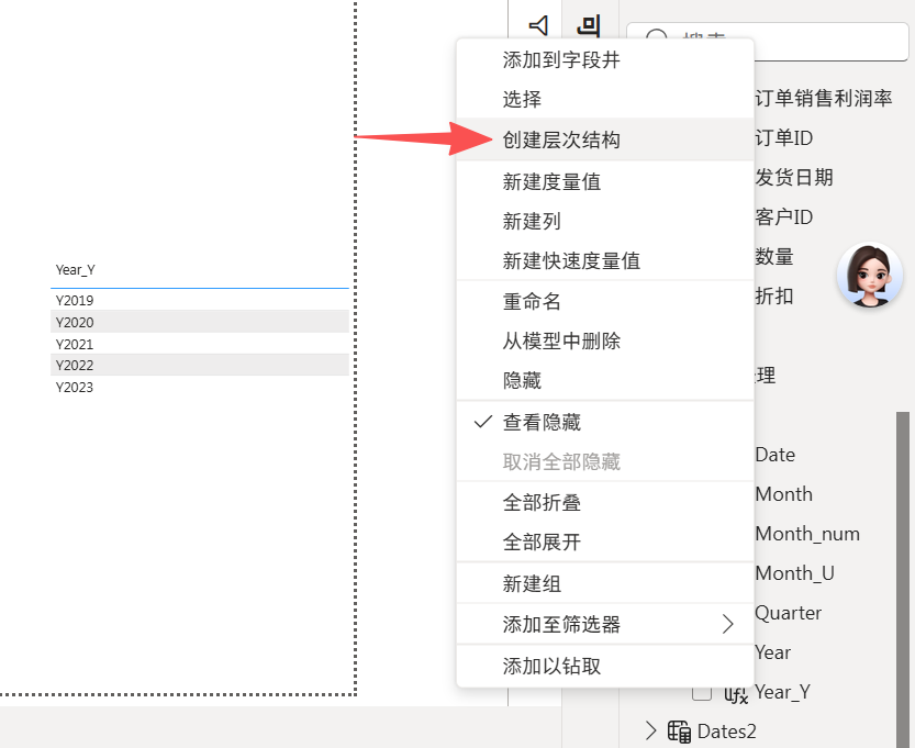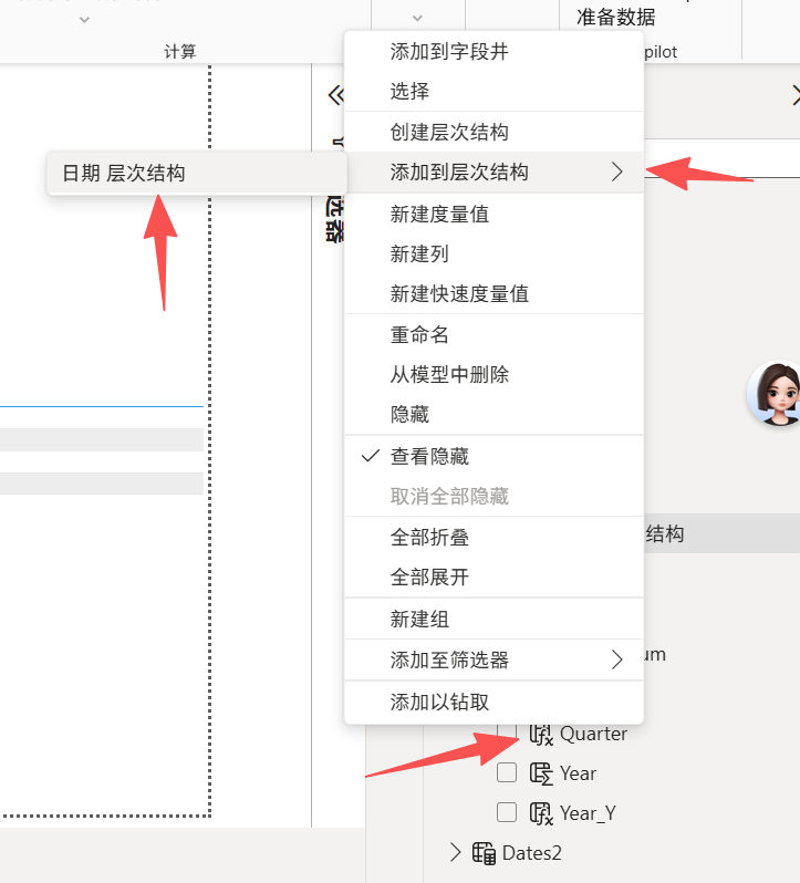 想把Quarter添加到日期层次结构。把鼠标放到Quarter上,右键,然后下面操作
