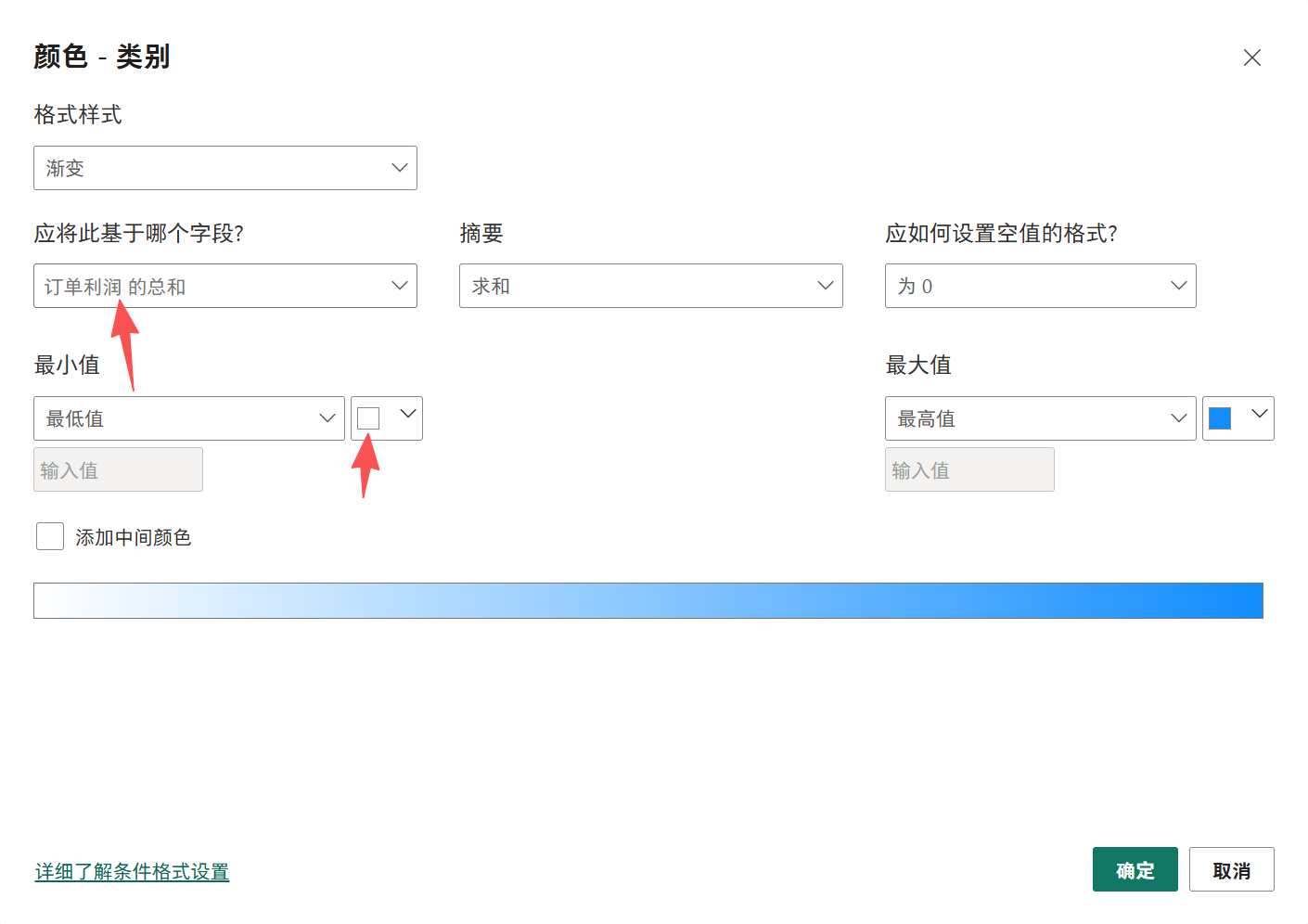 字段选择 与销量不同的利润,最小值选白色