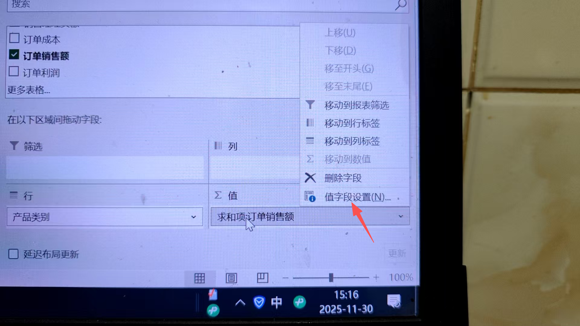 然后在 值 字段上 点击左键,值字段设置