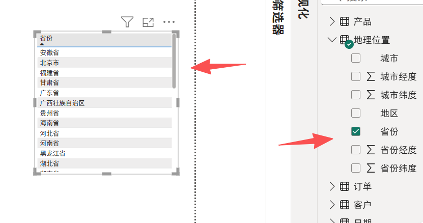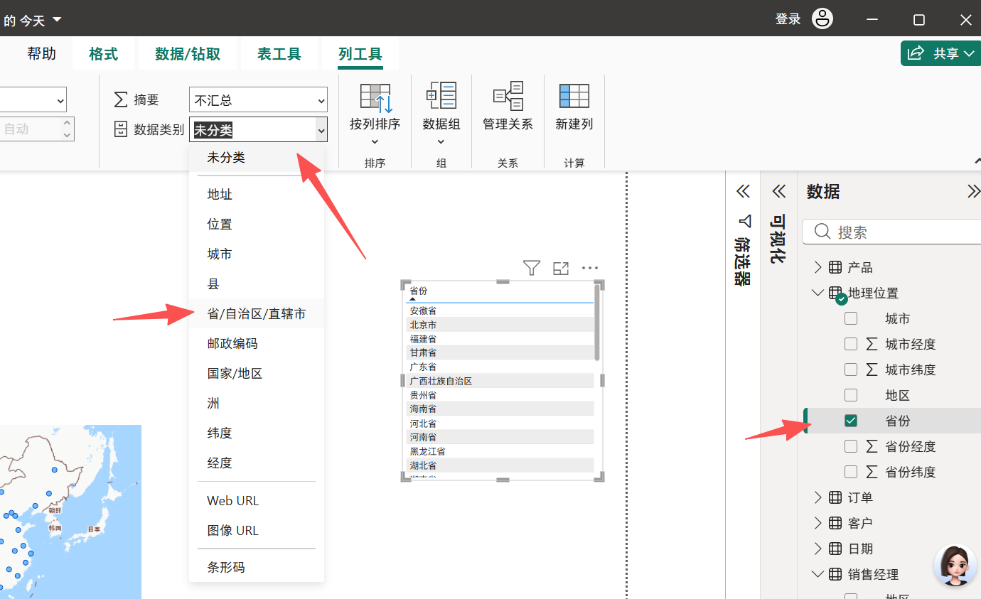 选中省份------》列工具------》属性------》数据类别------》选省/自治区/直辖市