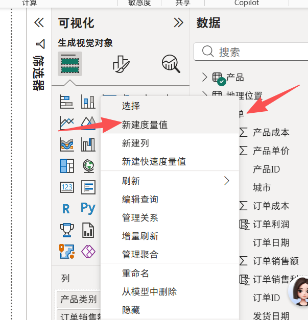 选中订单这个表格------》右键------》新建度量值