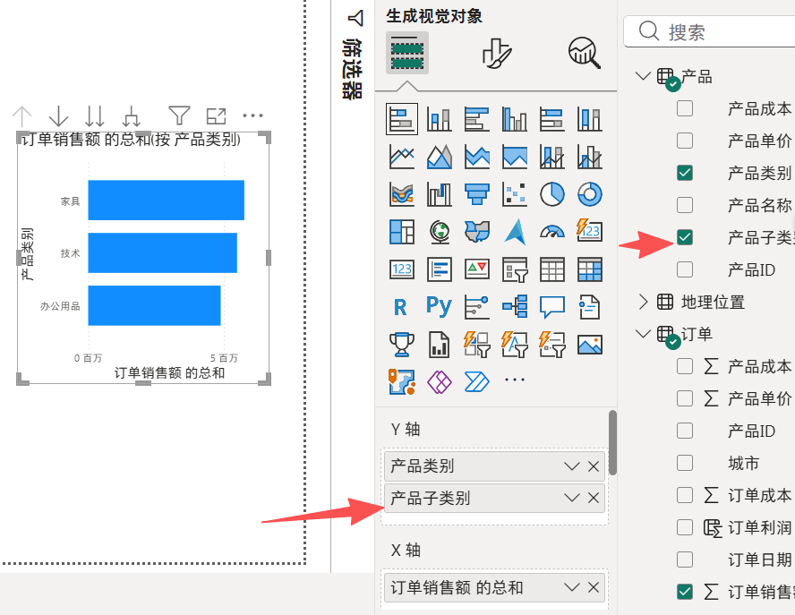 此时把产品子类别加入到Y轴去