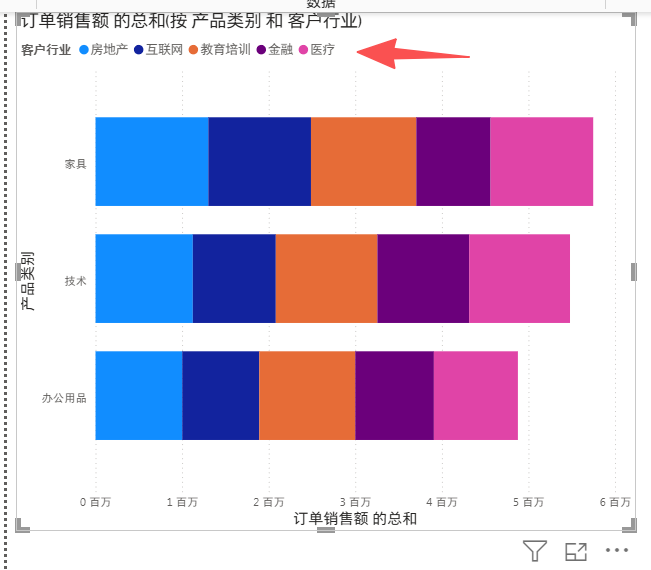 同一个类别只是,图例上显示的颜色不同,在每一行数据上显示的是子类别