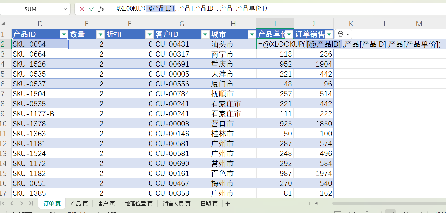 =@XLOOKUP([@产品ID],产品[产品ID],产品[产品单价])