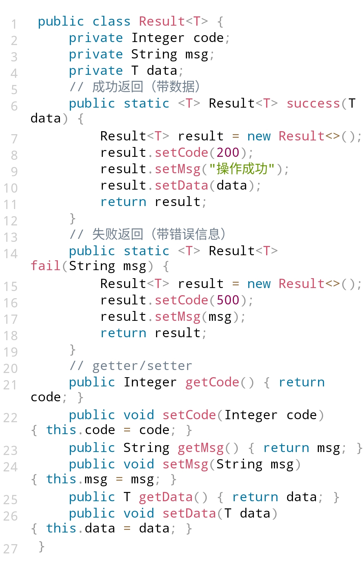 - 接口返回通常设计为对象,包含状态码、错误信息、真实数据: