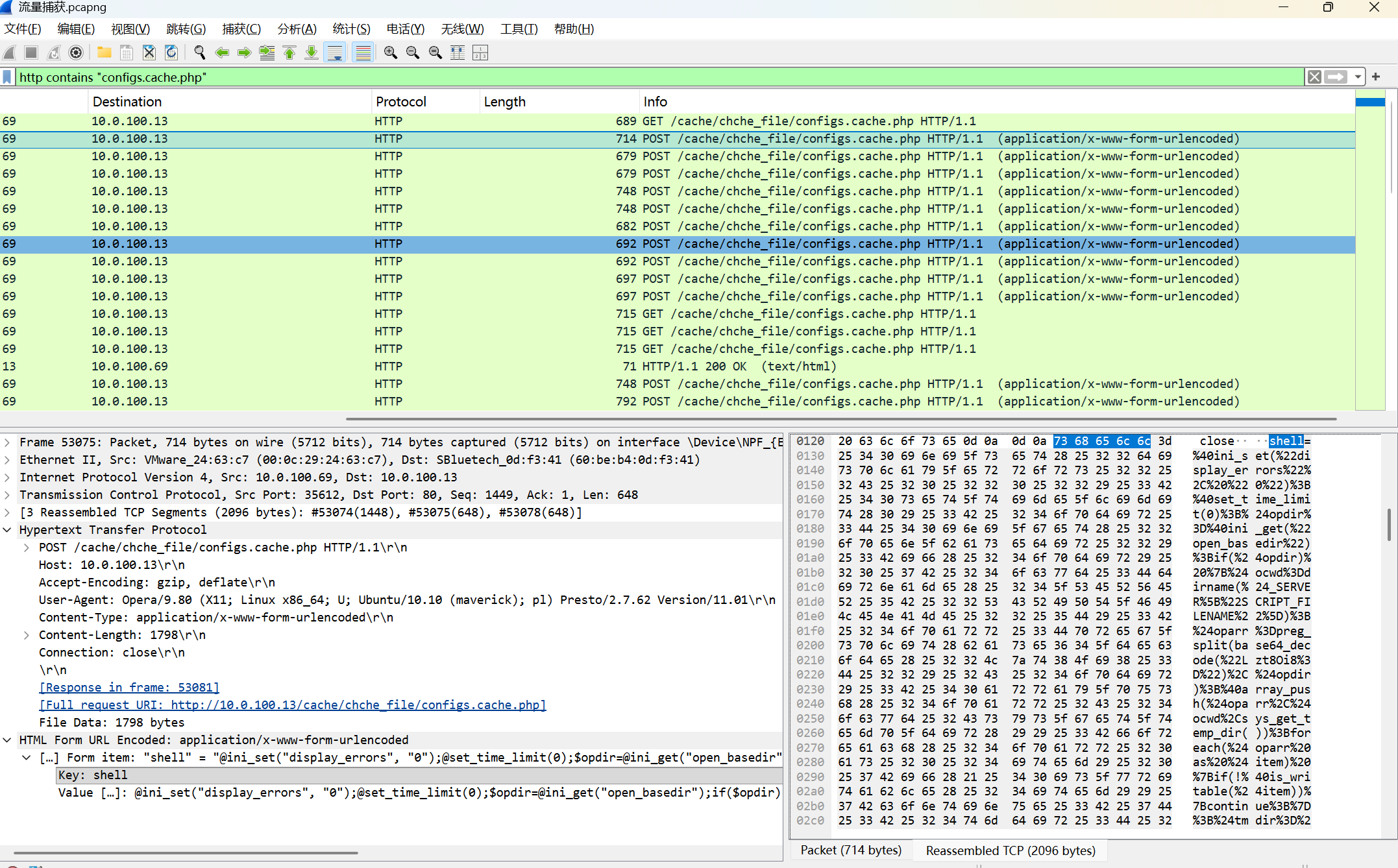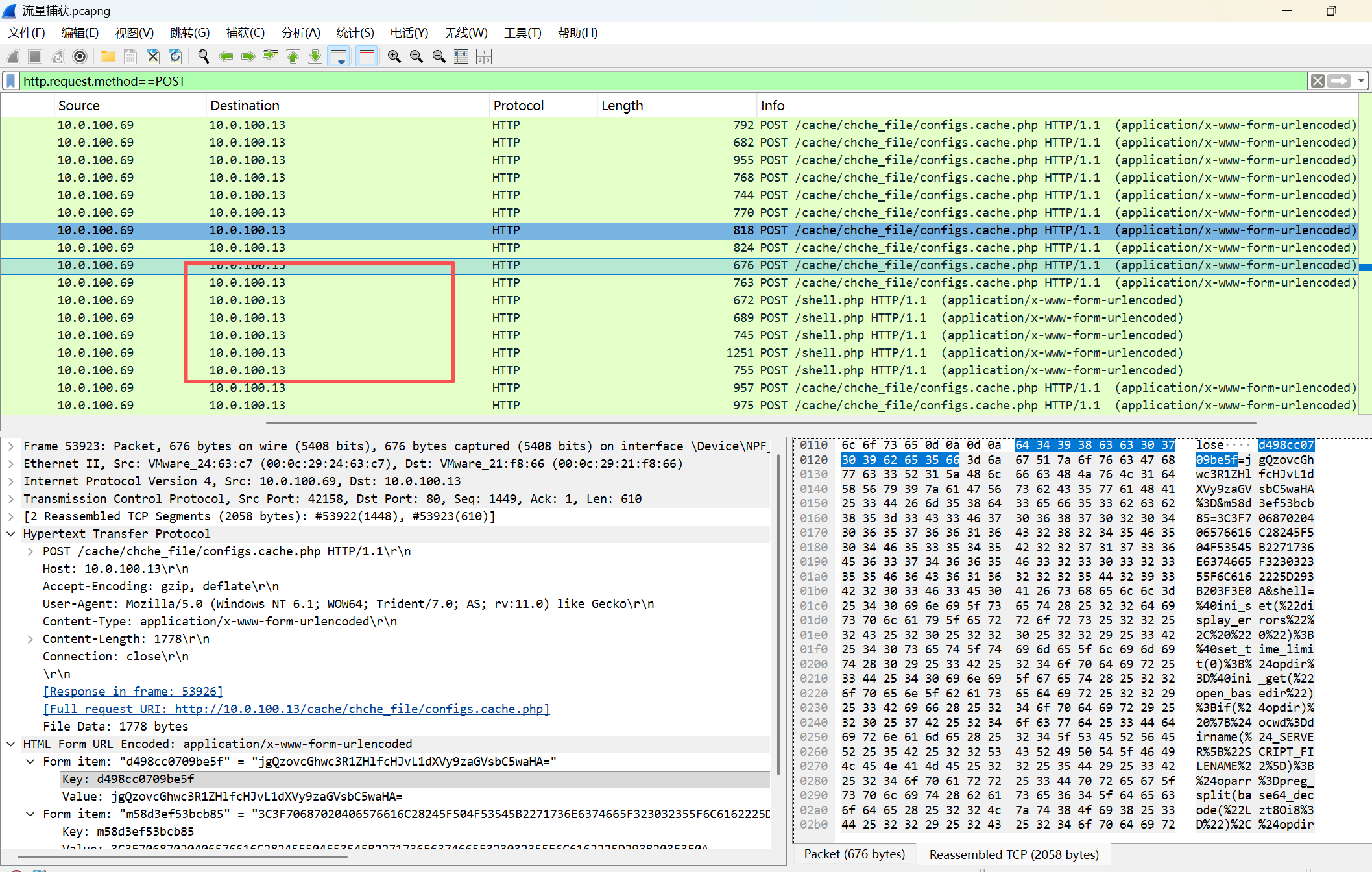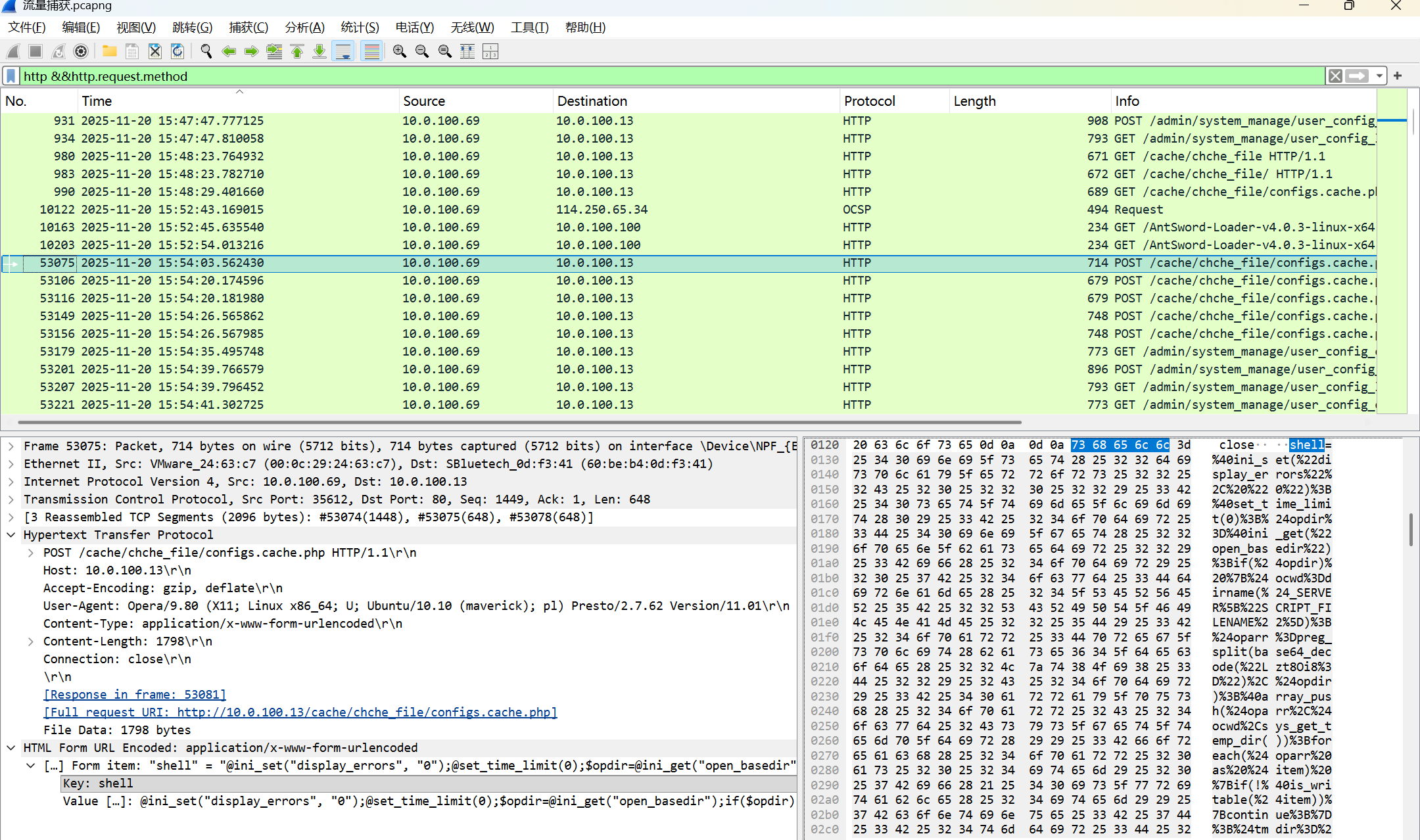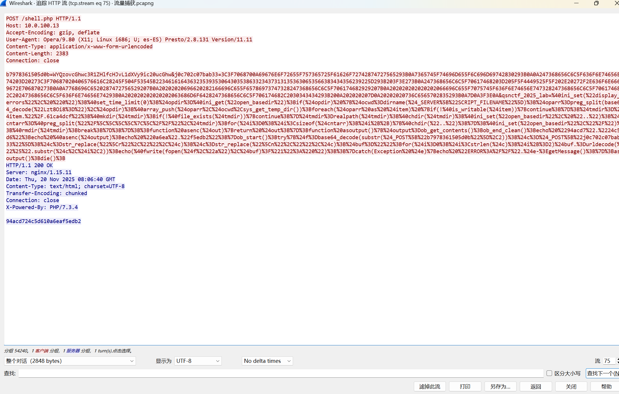 这里我直接筛选了http的POST流量,因为想赶紧做题,然后看到了一个shell.php,这不就知道了吗