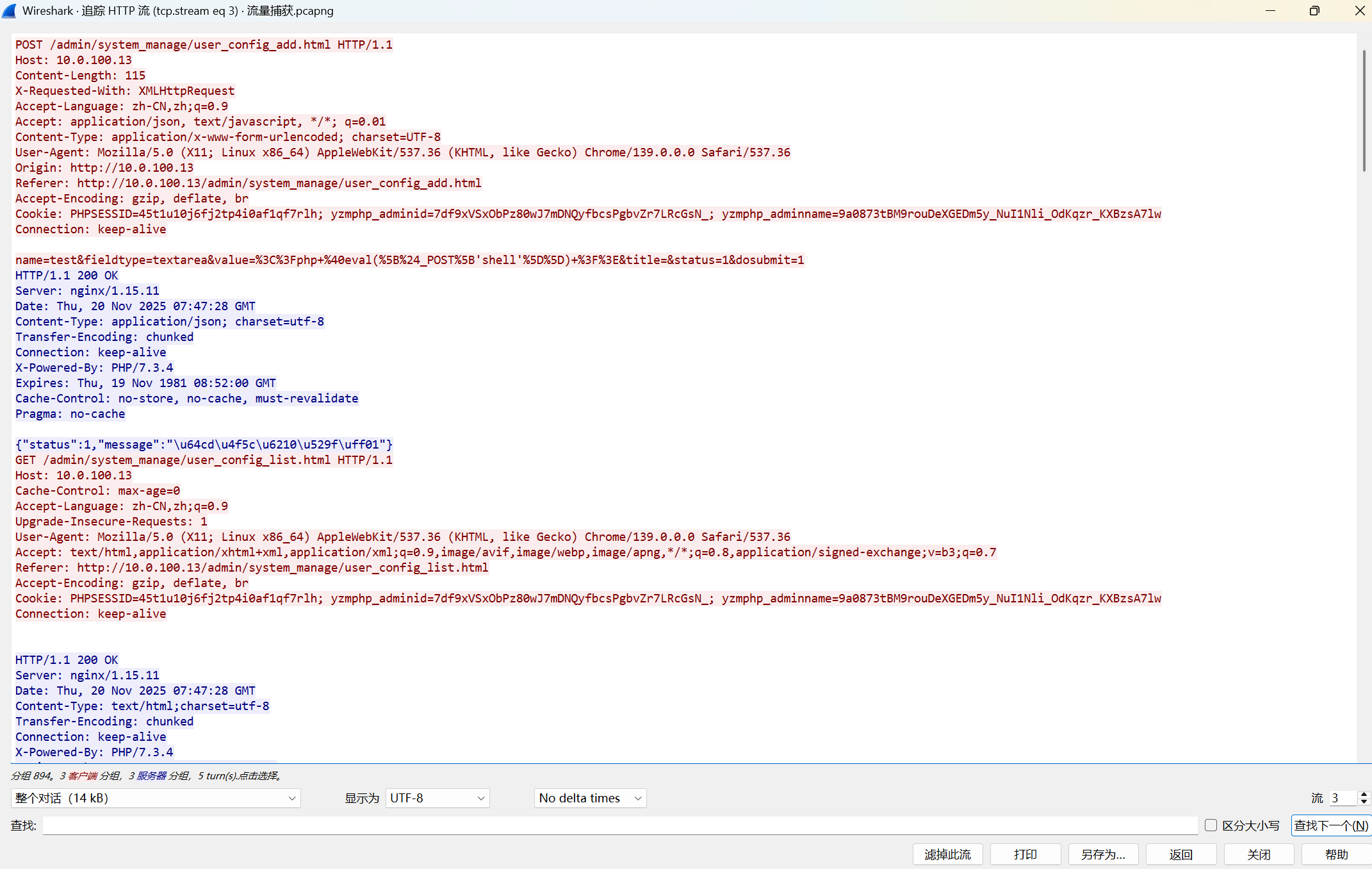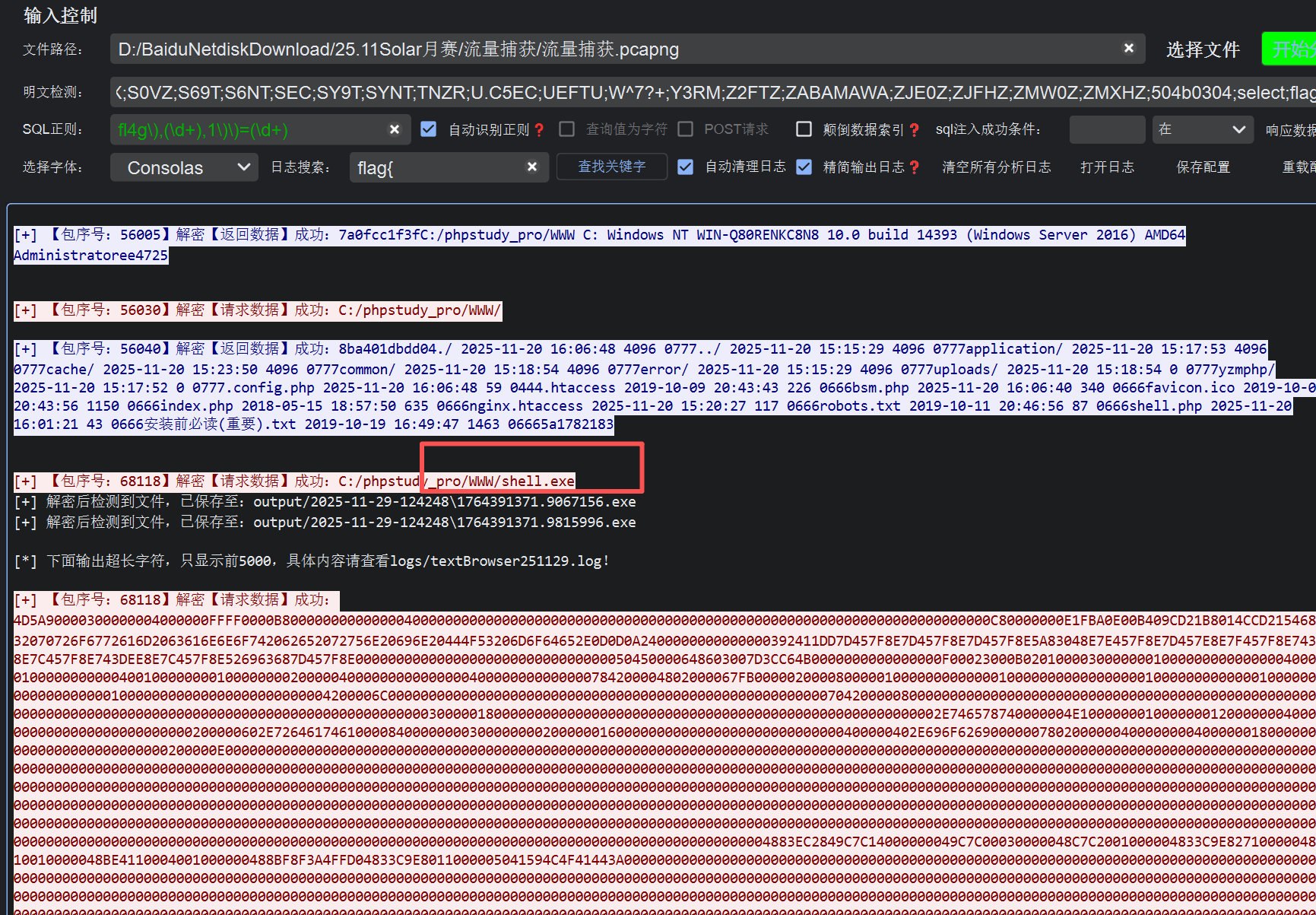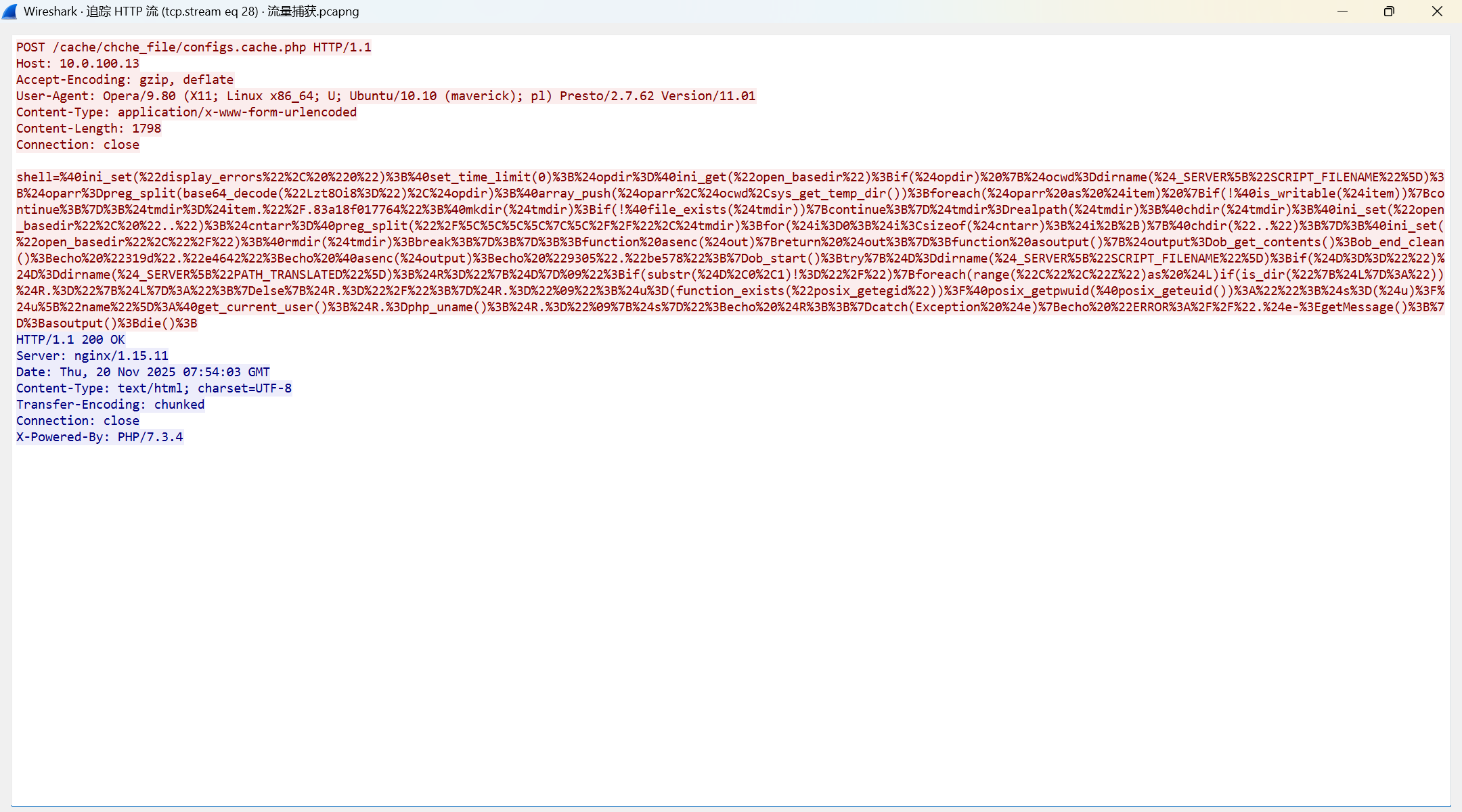 这里我直接筛选了http的POST流量,因为想赶紧做题,然后看到了一个shell.php,这不就知道了吗