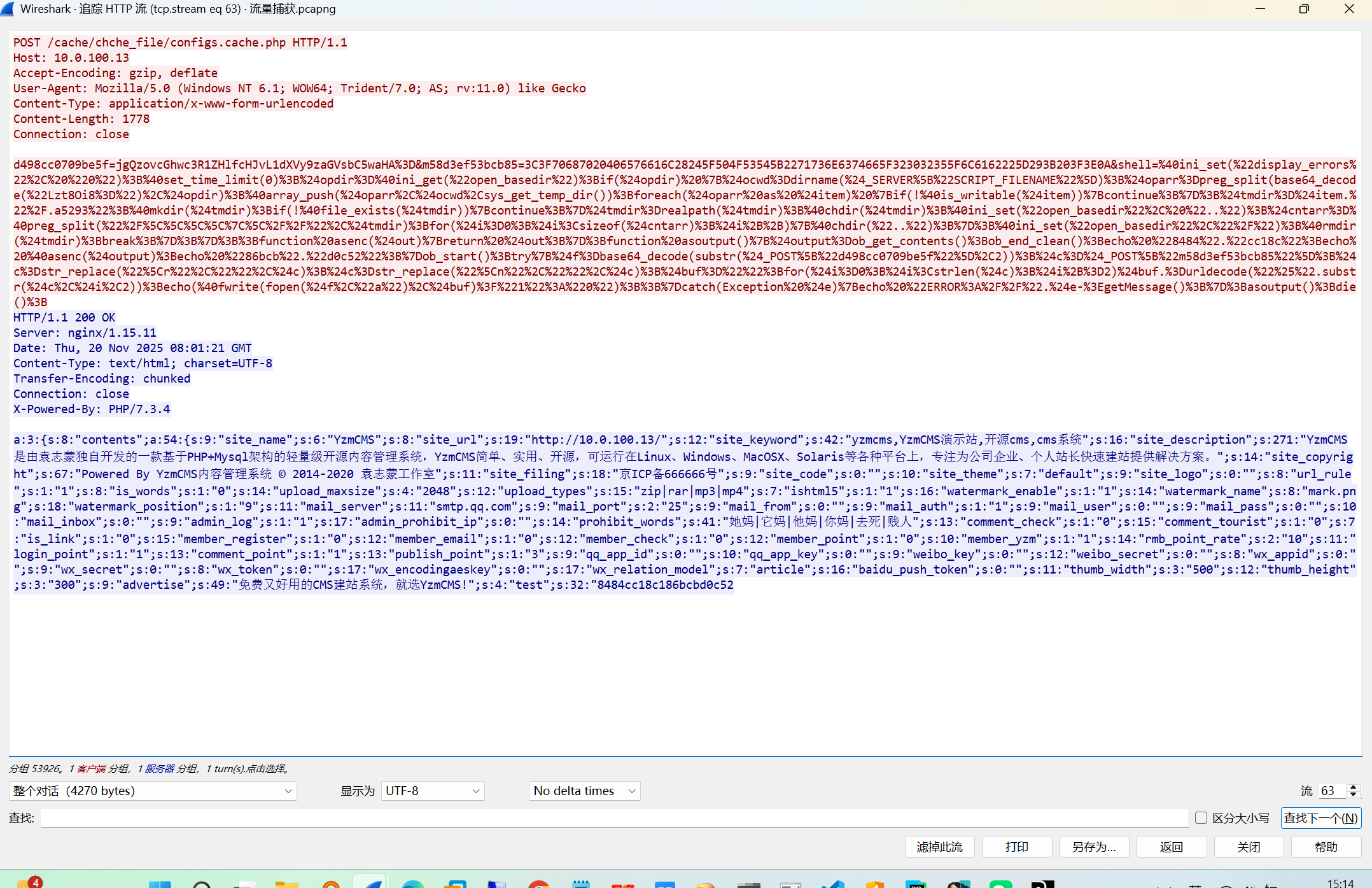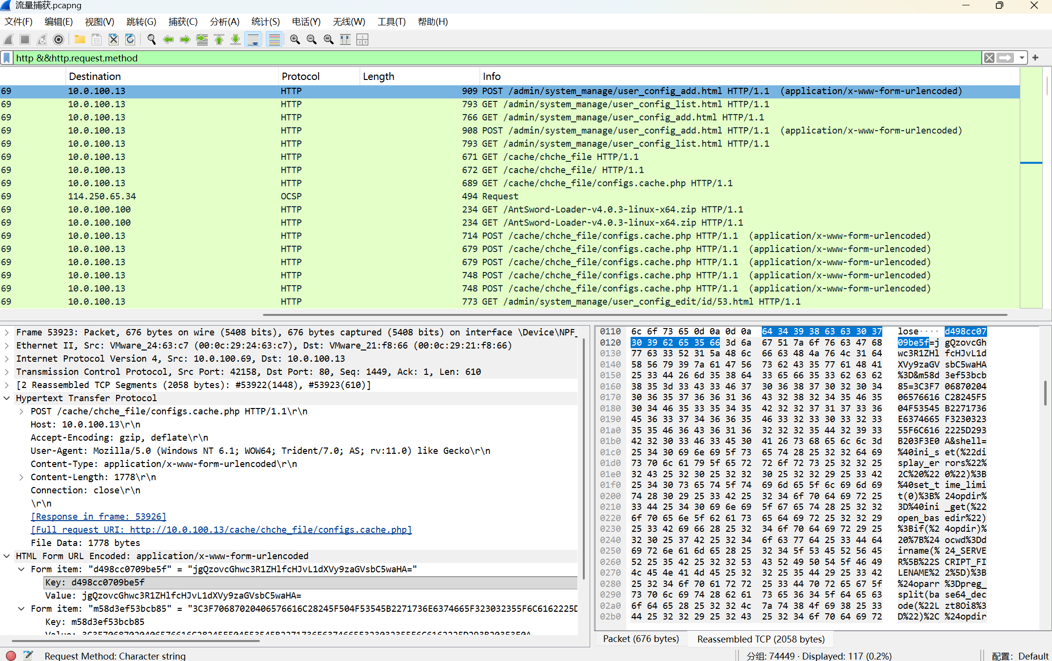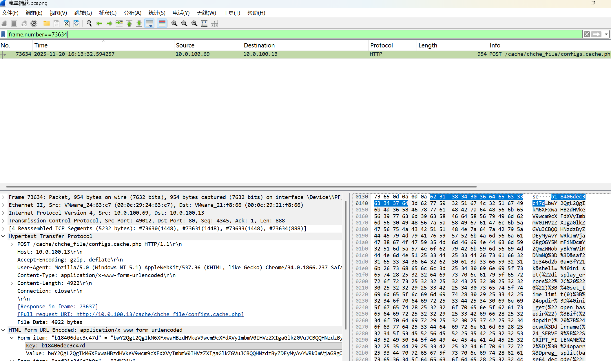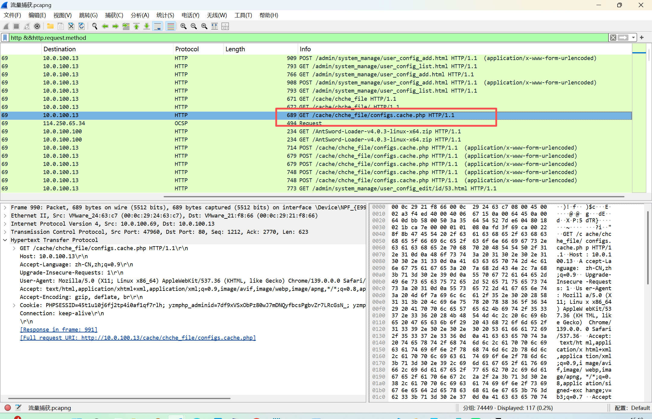 这里我直接筛选了http的POST流量,因为想赶紧做题,然后看到了一个shell.php,这不就知道了吗