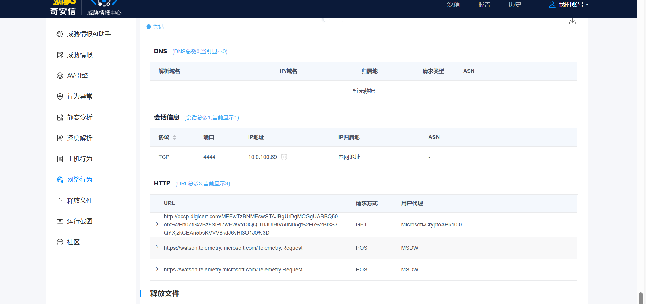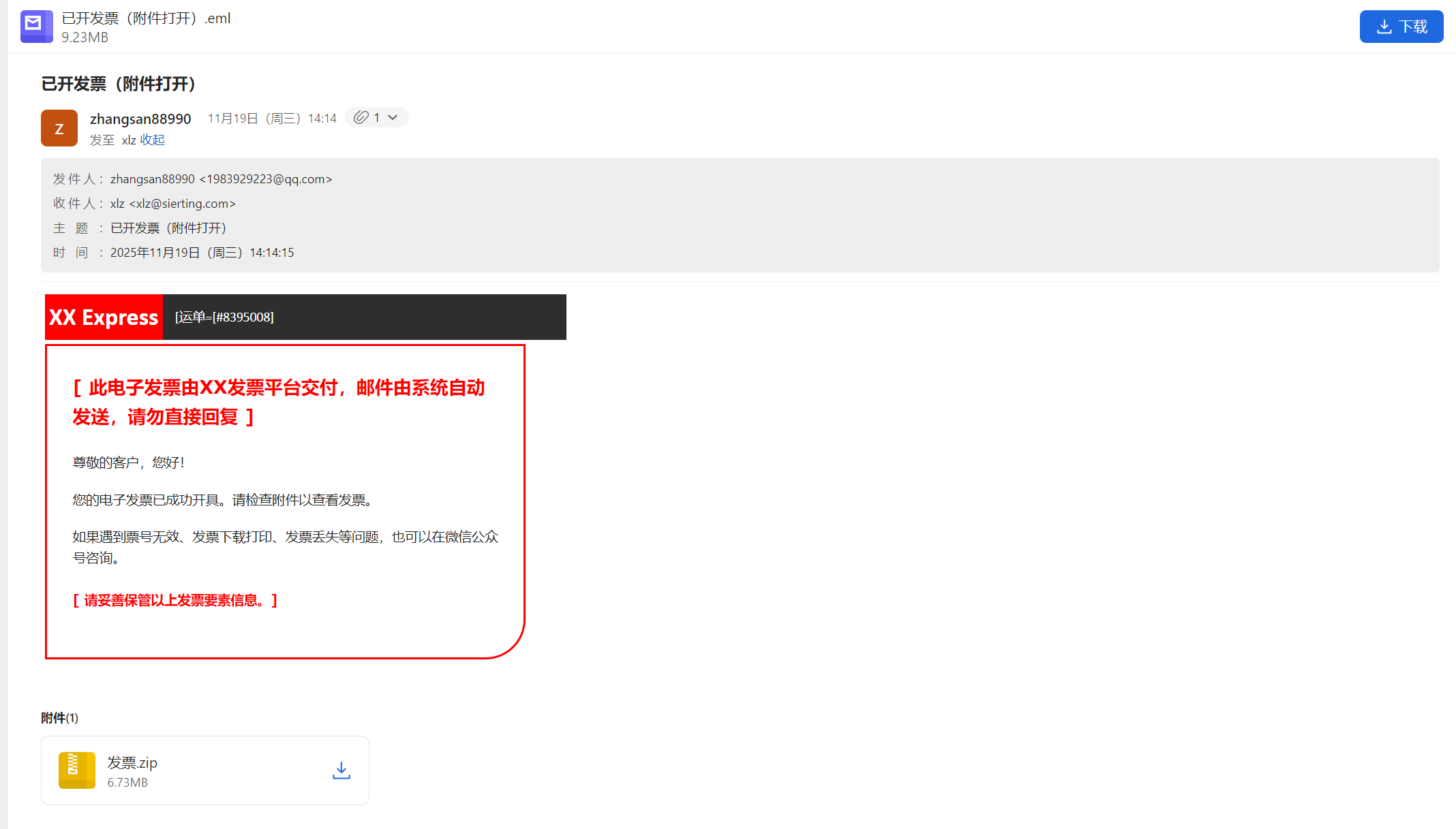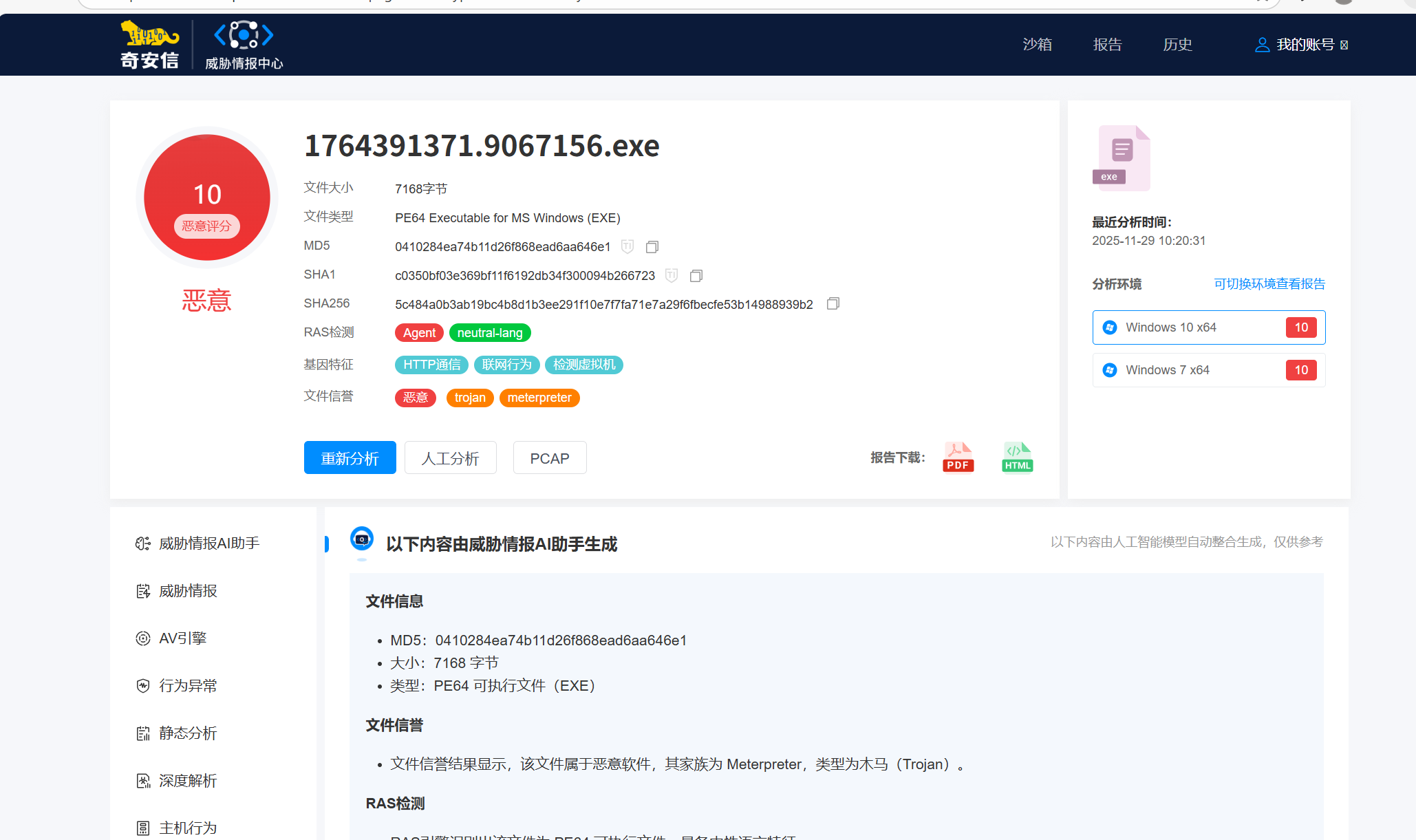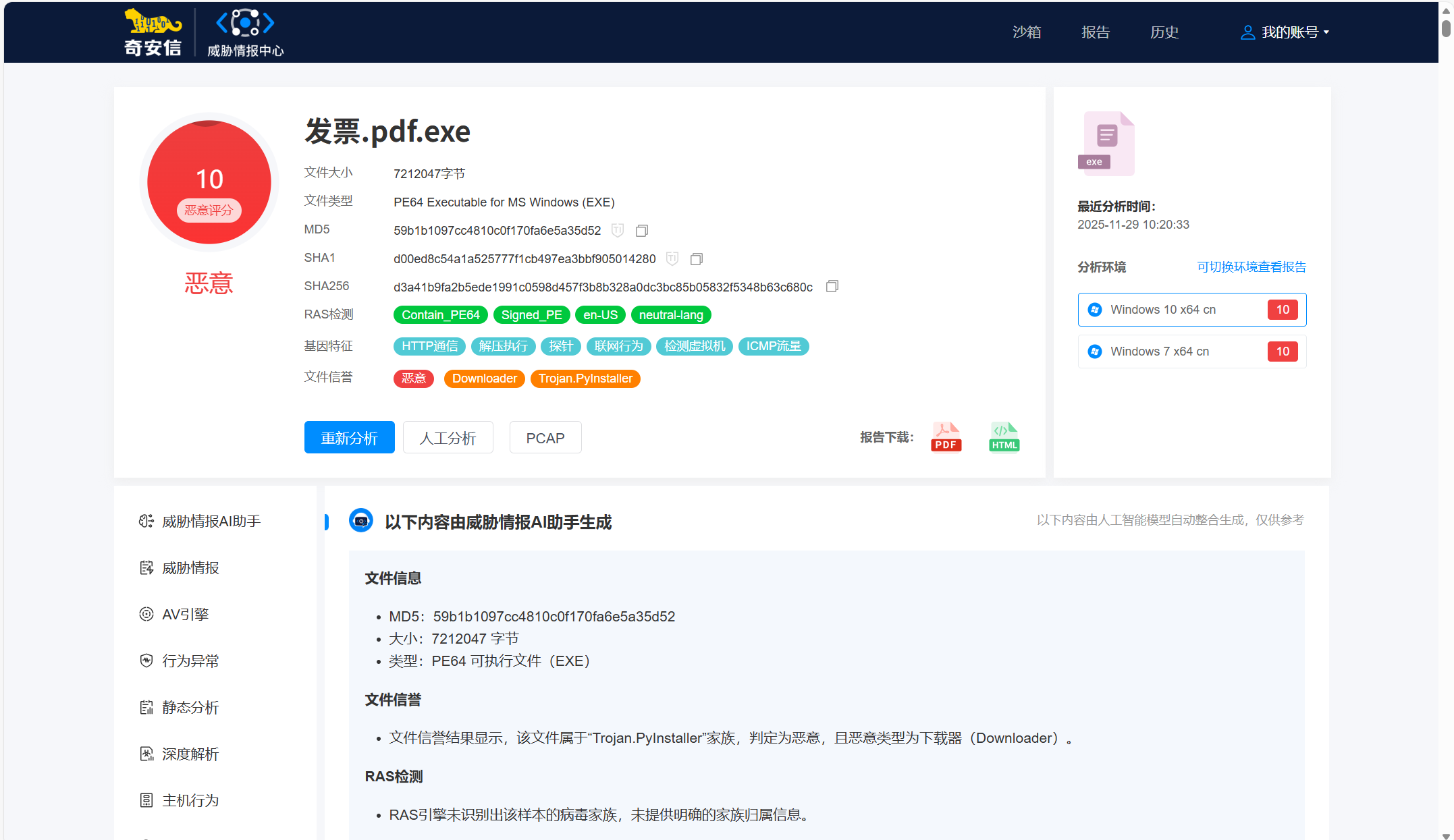 在邮件中有一个发票,下载之后是一个exe文件,这个使用沙箱跑一下或者在vmware中跑一下即可,我这里使用的奇安信沙箱跑的