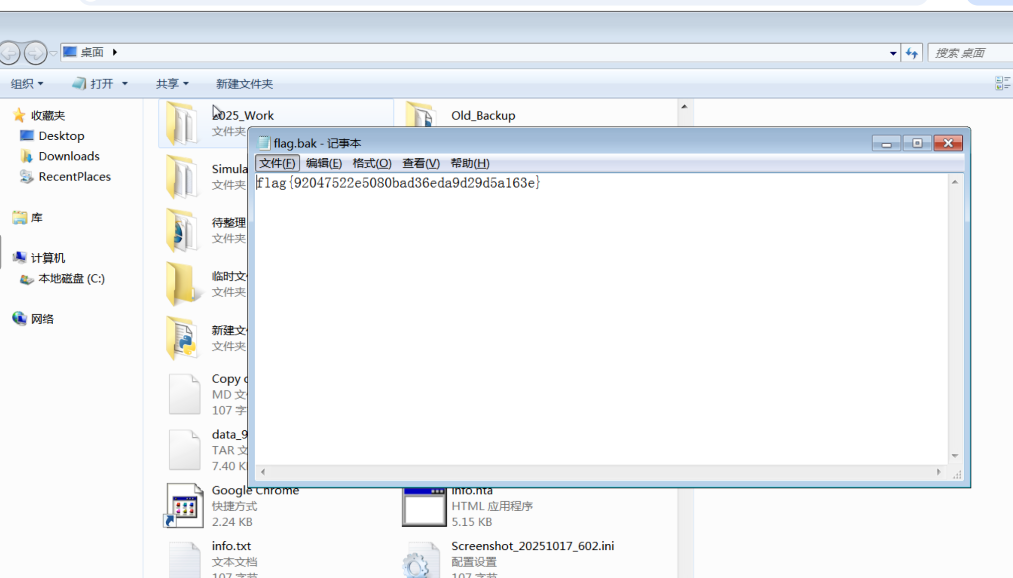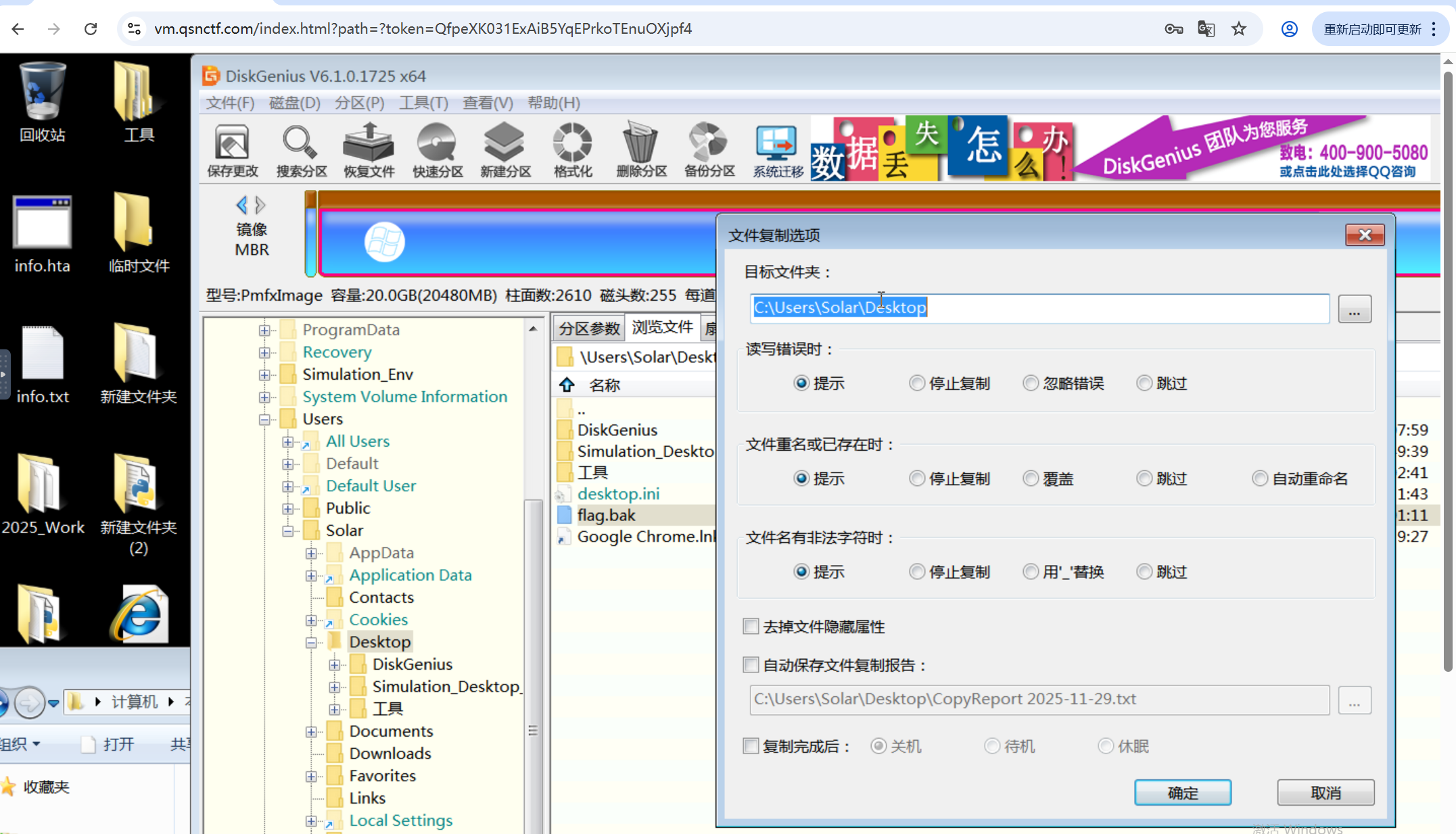 使用工具进行恢复吧,把C:\Users\Solar\Desktop\工具\backup中的pmfx拖入到diskgenus工具中,然后把flag.bak复制到桌面,查看即可