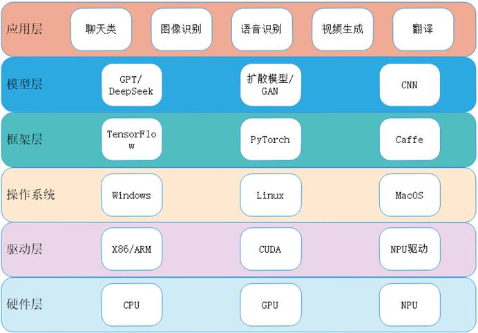 硬件之上就是驱动层。驱动的宿主是操作系统。所有硬件设备都需要驱动来管理。CPU本身其实也需要驱动,只不过因为CPU往往承担了主人的身份,我们不将这部分称呼为驱动,而是架构。操作系统的架构层包括了各种架构的CPU芯片,比如X86架构,ARM架构等。而附着在CPU周边的硬件设备,其管理软件则被正式称呼为驱动。GPU也需要驱动,只不过在人工智能时代,GPU的驱动已远远超出常规的图形驱动范围,不再简单是操作系统图形架构的末端死板执行者,而是转变为一种计算设备。我们可以在CPU端编写计算逻辑,然后通过这个特殊驱动提交给GPU执行。英伟达将其称为CUDA。不同的芯片厂家,其提供的计算框架不同。有了这一层封装,GPU就可以按自己的节奏进行升级换代,从而实现与CPU的解耦。NPU也是类似,虽然其不如GPU那样灵活通用,但是要工作起来,仍然需要相关的驱动,这一点是不变的。