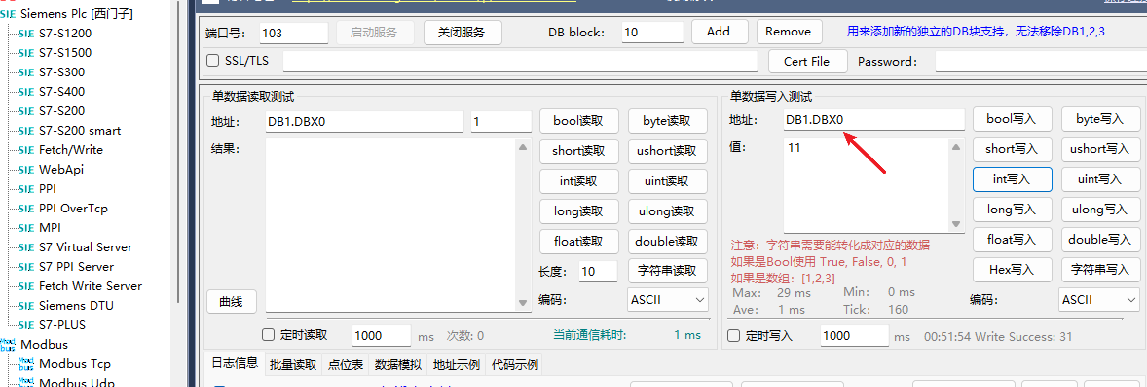 plc.connect('127.0.0.1', 0, 1, 103) # IP地址, rack, slot, port