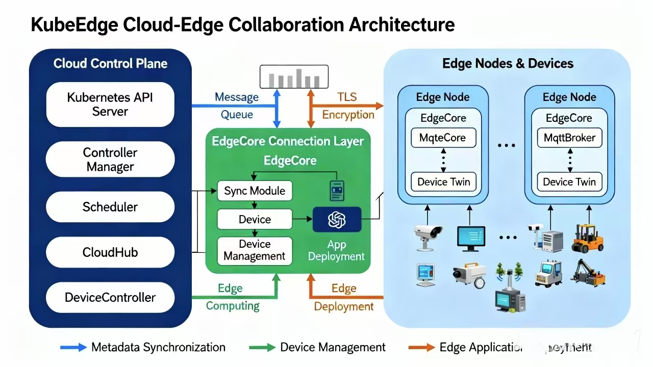 KubeEdge将Kubernetes原生的容器编排能力延伸至边缘环境,解决了边缘场景下的网络不稳定、资源受限等挑战。在Kurator体系中,KubeEdge负责管理边缘节点和设备,实现云边协同。