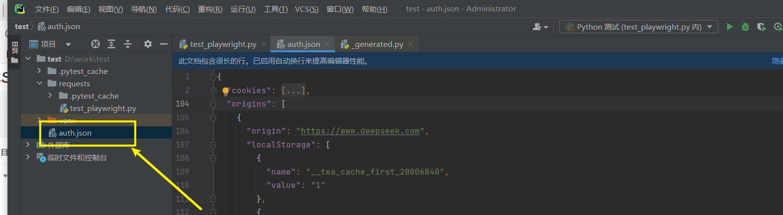 执 行身份 验证 并关 闭浏览 器后, auth.json 将包含存 储 状 态 。