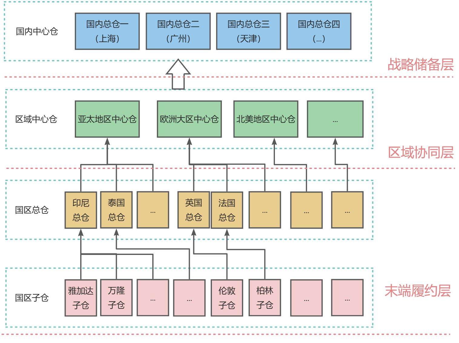 作为一个全球供应链体系的仓储结构,物理仓储结构大致分为了4层仓储结构。分别是国内中心仓,区域中心仓、国区中心仓、国区子仓。