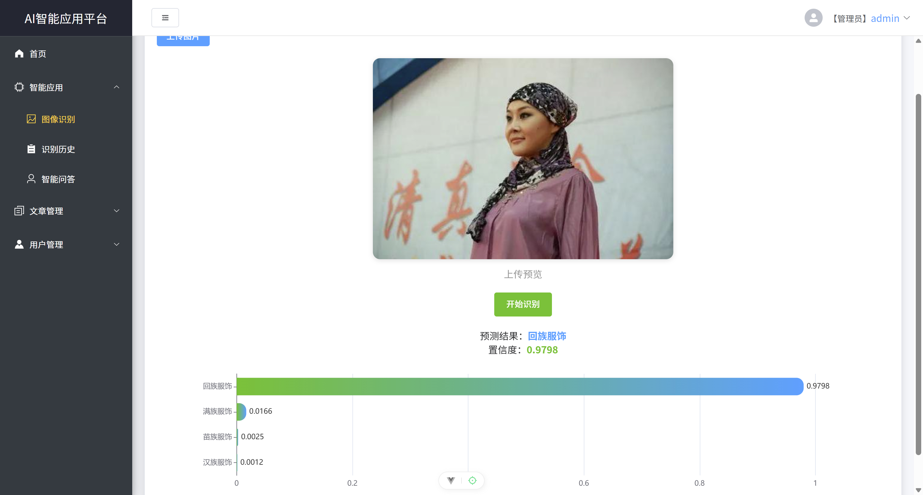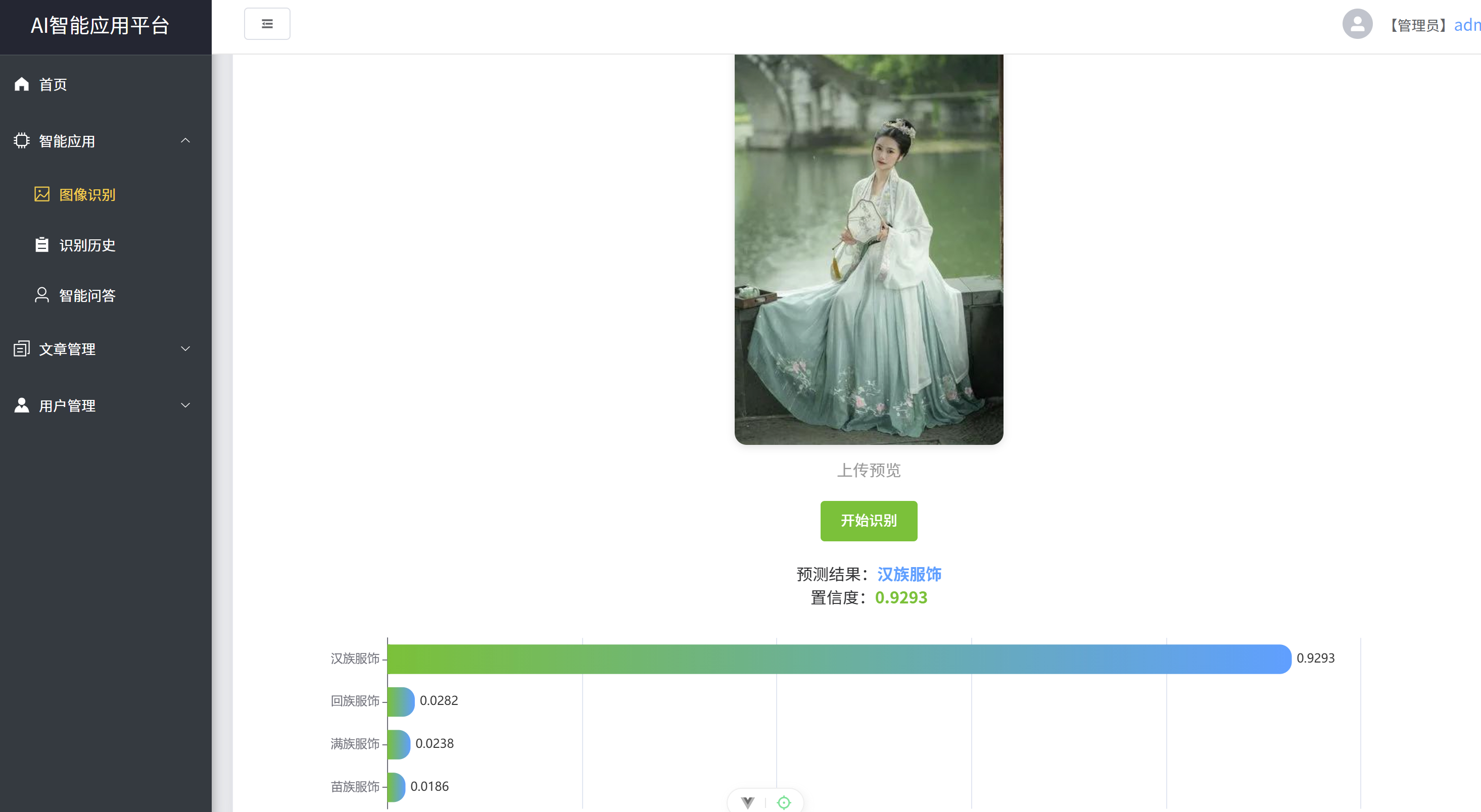 随着人工智能技术的快速发展,计算机视觉在文化传承与保护领域的应用日益广泛。民族服饰作为民族文化的重要载体,其识别与分类对于文化研究与数字化保护具有积极意义。传统人工识别方式效率有限,难以适应大规模图像处理需求。基于此背景,本研究旨在开发一套基于深度学习的民族服饰智能识别与分析系统。系统采用TensorFlow框架,基于卷积神经网络(CNN)构建高精度识别模型,实现对回族、汉族、满族、苗族四类典型民族服饰的自动化识别。通过集成Web可视化平台,系统不仅提供图像识别、置信度分析和可视化图表展示等核心功能,还结合内容管理与智能问答模块,构建了集文化识别、知识传播与交互体验于一体的综合平台,为民族文化的数字化保护与推广提供了有效的技术支撑。