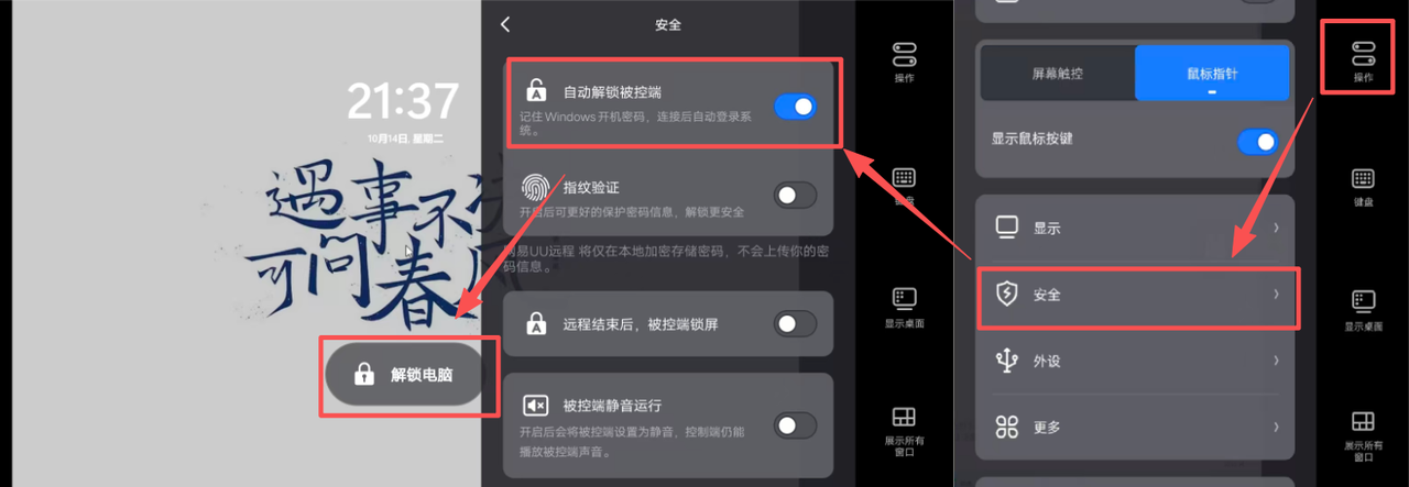 UU远程的**"自动解锁"**功能(如上图设置界面),是无人值守场景的神来之笔。