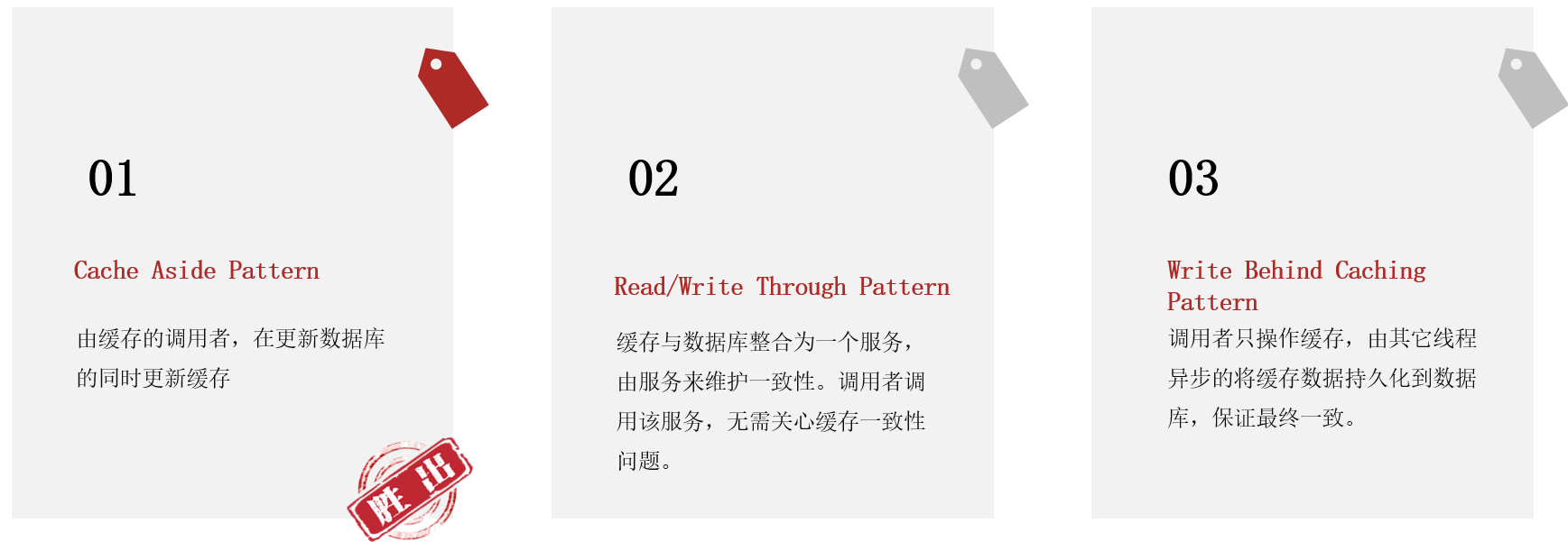- Cache Aside Pattern 人工编码方式:缓存调用者在更新完数据库后再去更新缓存,也称之为双写方案