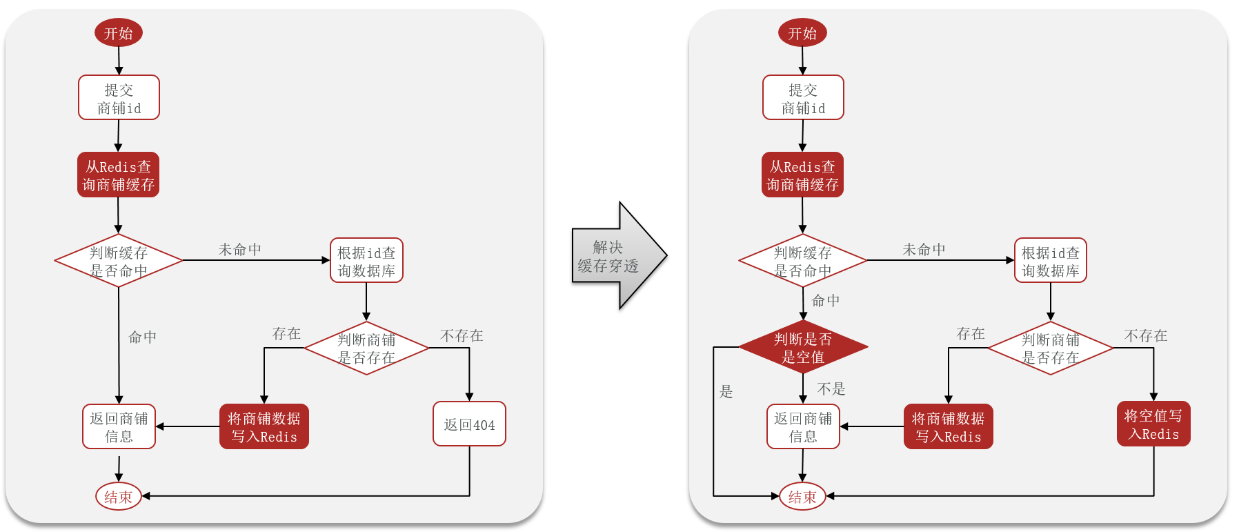 - 在原来的逻辑中,我们如果发现这个数据在mysql中不存在,直接就返回404了,这样是会存在缓存穿透问题。