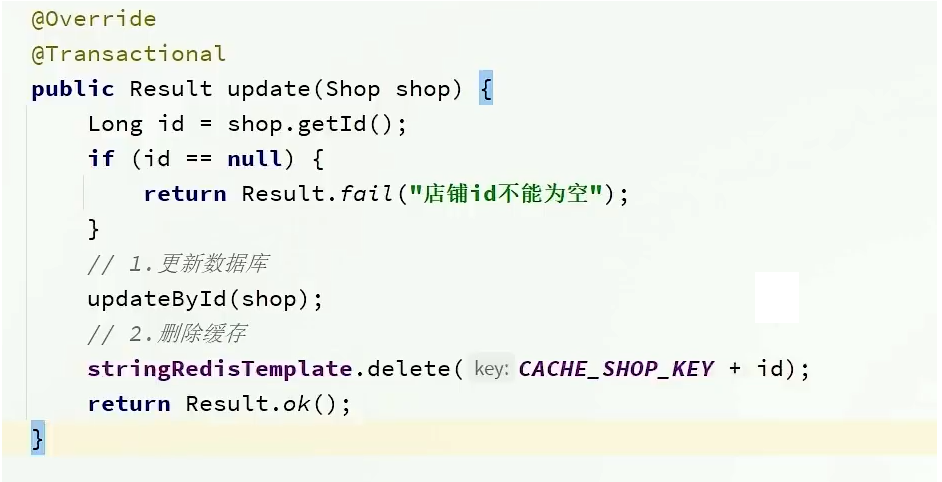 - 修改重点代码2:通过之前的淘汰,我们确定了采用删除策略,来解决双写问题,当我们修改了数据之后,然后把缓存中的数据进行删除,查询时发现缓存中没有数据,则会从mysql中加载最新的数据,从而避免数据库和缓存不一致的问题