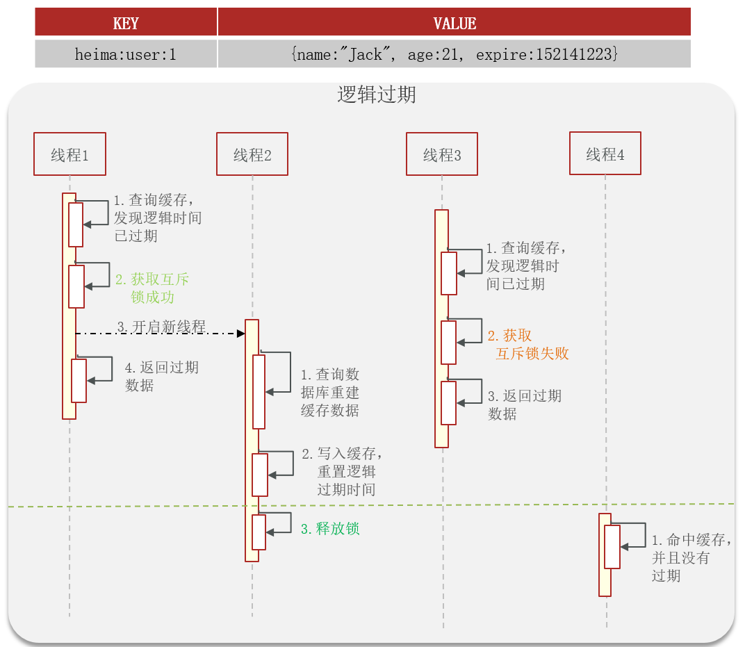 - 思路分析:当用户开始查询redis时,判断是否命中,如果没有命中则直接返回空数据,不查询数据库,而一旦命中后,将value取出,判断value中的过期时间是否满足,如果没有过期,则直接返回redis中的数据,如果过期,则在开启独立线程后直接返回之前的数据,独立线程去重构数据,重构完成后释放互斥锁。