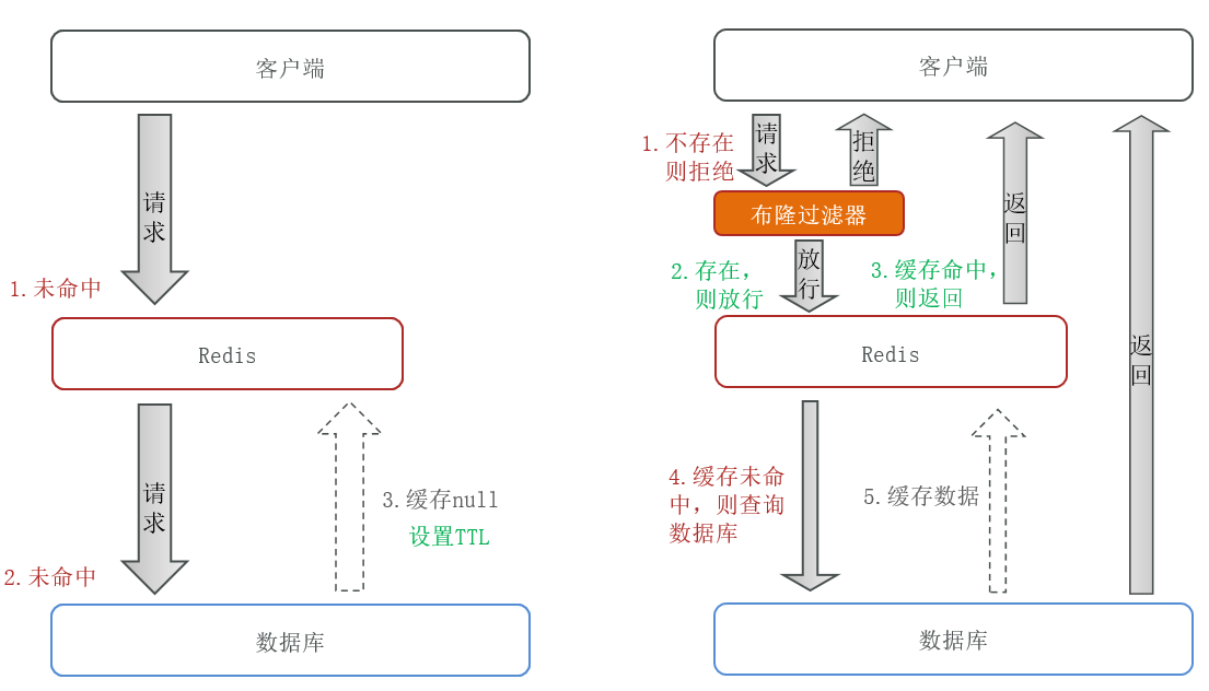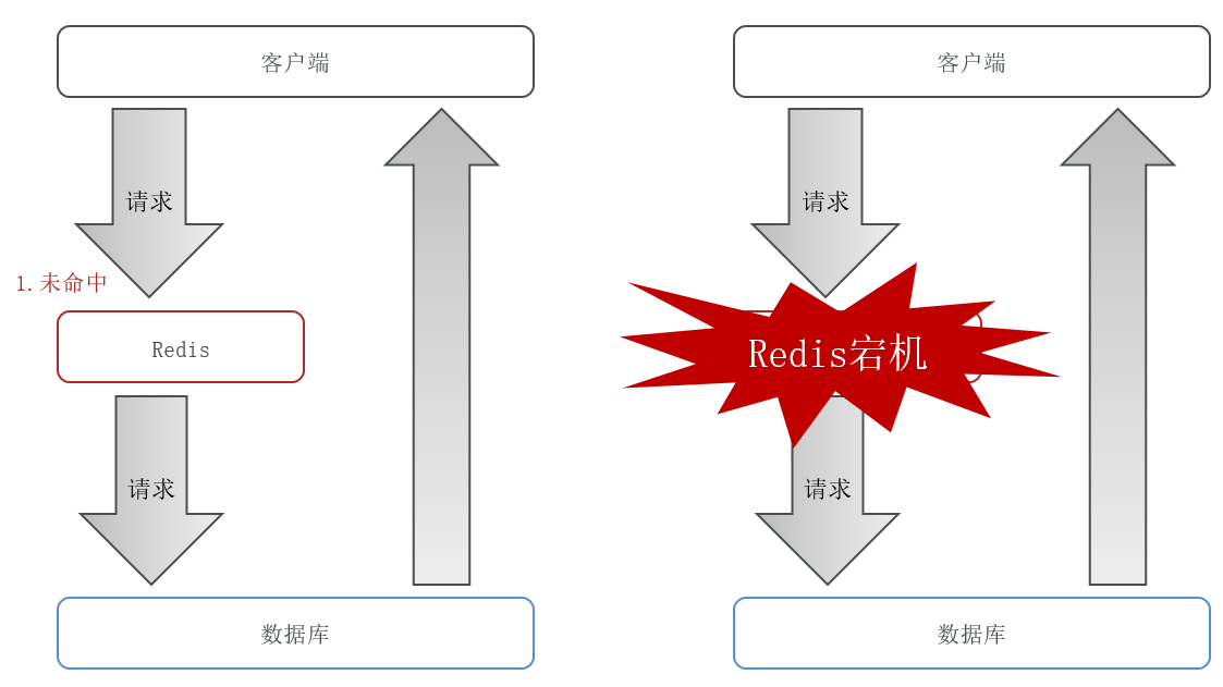 - 缓存穿透 :缓存穿透是指客户端请求的数据在缓存中和数据库中都不存在,这样缓存永远不会生效,这些请求都会打到数据库。