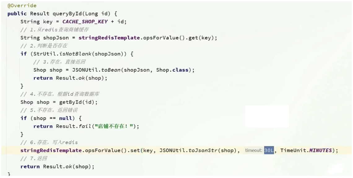 - 修改重点代码1:修改ShopServiceImpl的queryById方法,设置redis缓存时添加过期时间